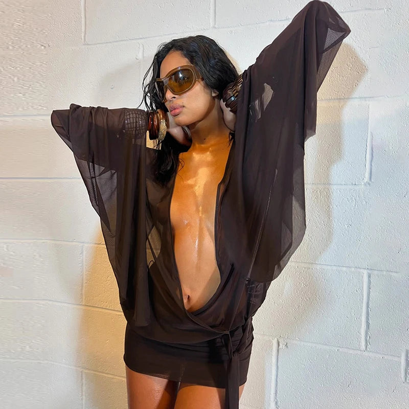 Women Mesh Irregular Mini Dress Sexy See Through Chic Long Sleeve Deep Low Neck Bandage Slim Vestidos Mujer Coquette Frock