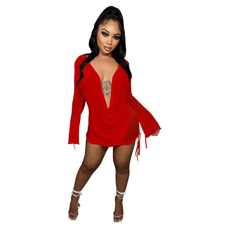 Sexy Mesh Deep V Elastic Dress Halter Elegant Chic Vintage Mini Dresses Long Sleeve Party Club See Through Bodycon Women's Night