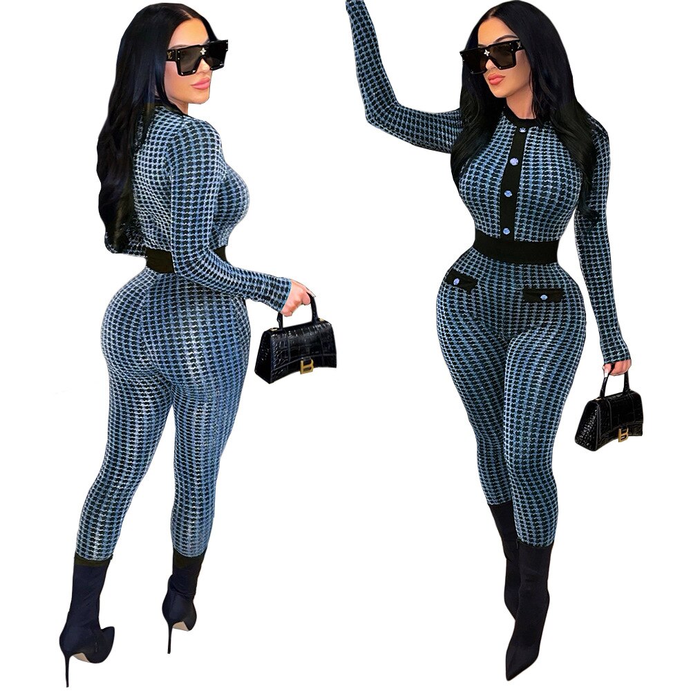 Sexy Plaid Print Buttons Jumpsuit Autumn Winter Women Long Sleeve Skinny Overalls