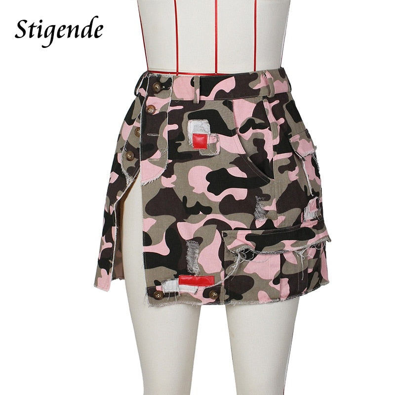 Stigende Women Sexy High Split Camouflage Skirt Army Green Ripped Irregular Skirt Spliced Color Pocket Button Long Maxi Skirt