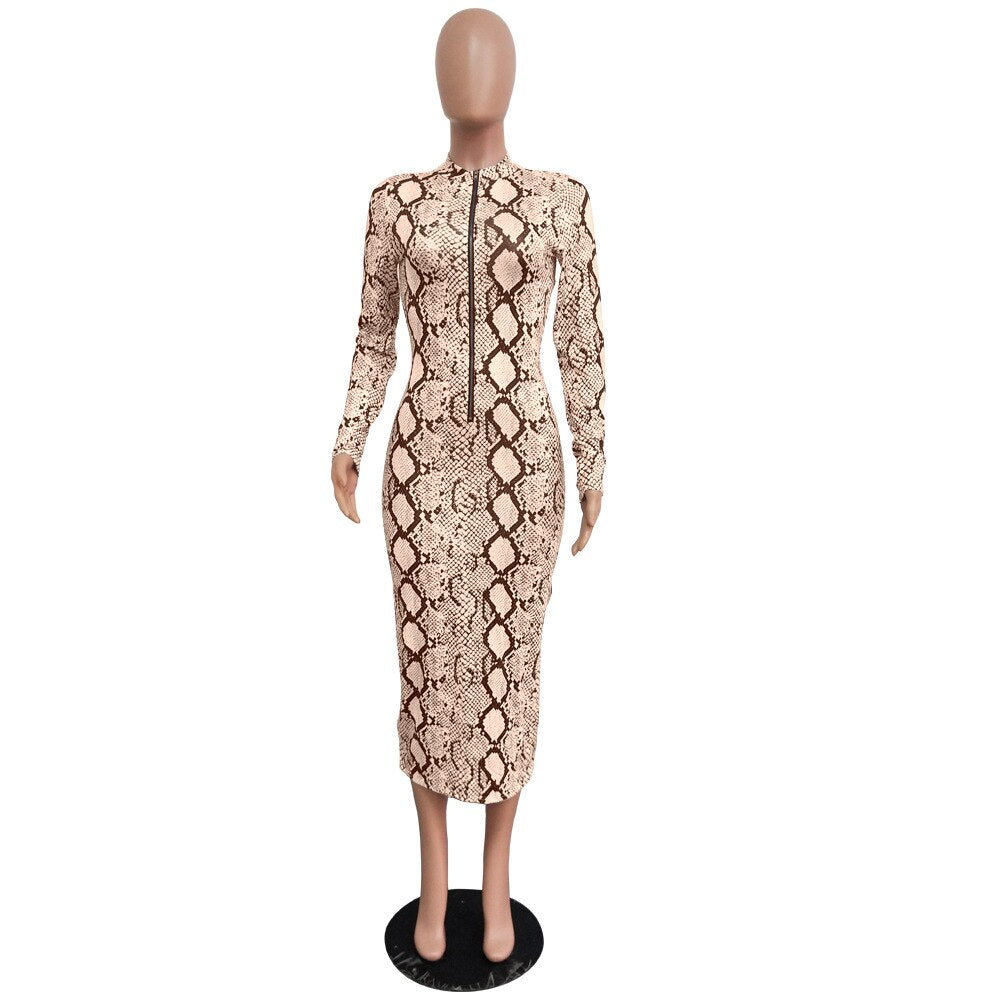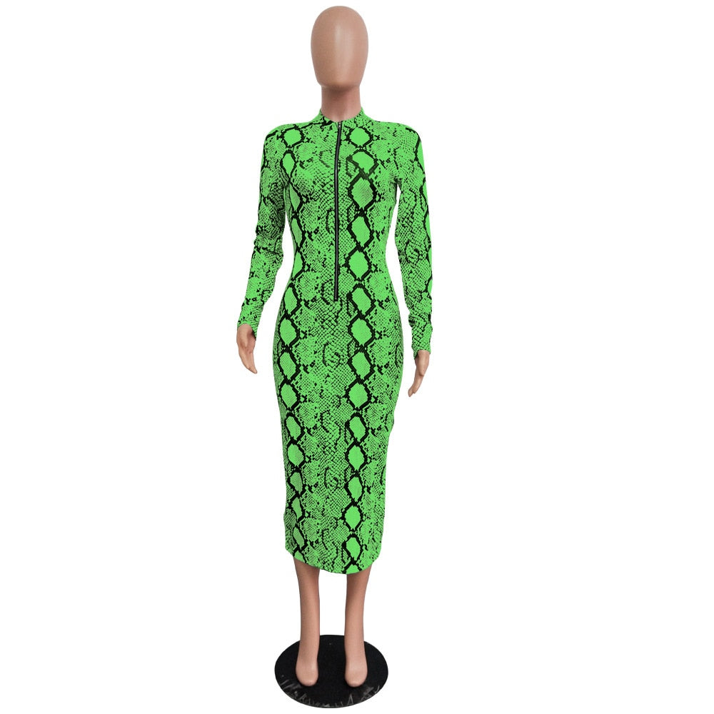Echoine Sexy Snake Print Bodycon Long Dress Long Sleeve Zipper Women Autumn Evening Party Night Dress Vintage Vestidos Outfits