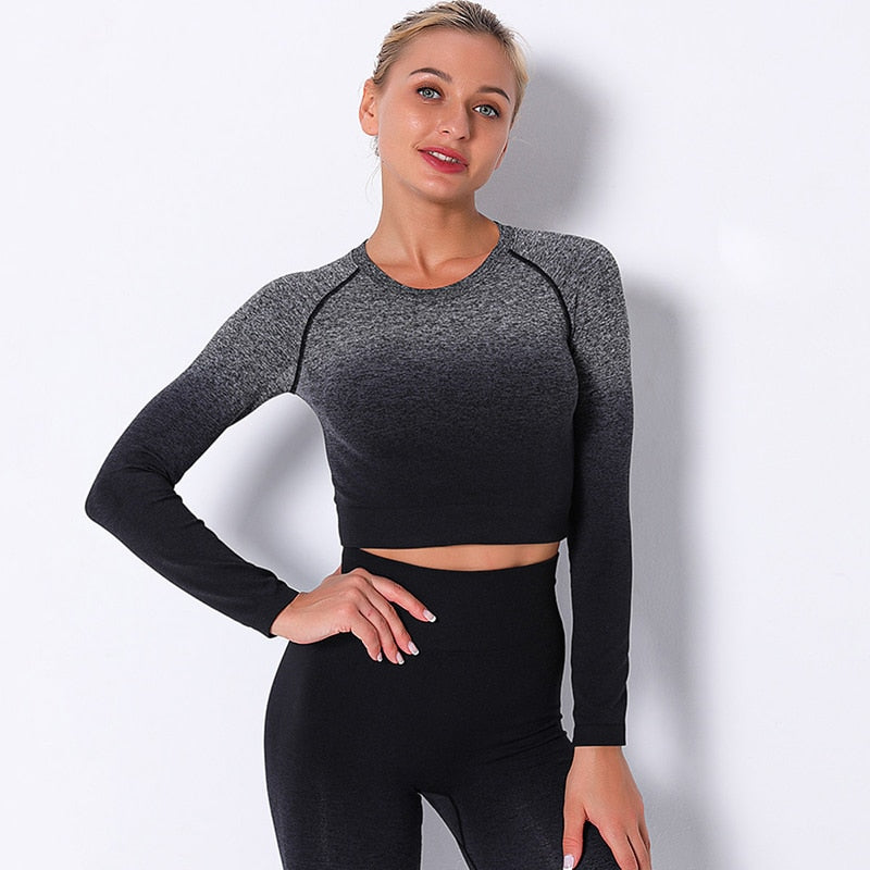 • Sexy Women's Tracksuit Seamless Sports Fitness Suit Long Sleeve Crop Top High Waist Leggings Set Hang Dye Winter Clothes Women