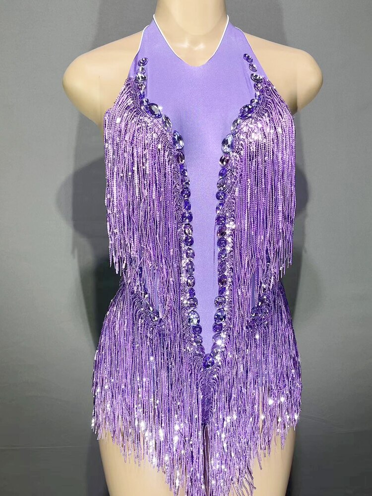 • Sparkly Rhinestones Sequins Tassel Leotard Women Nightclub Outfit Singer Dancer Costume Stage Wear Sexy Performance Bodysuit