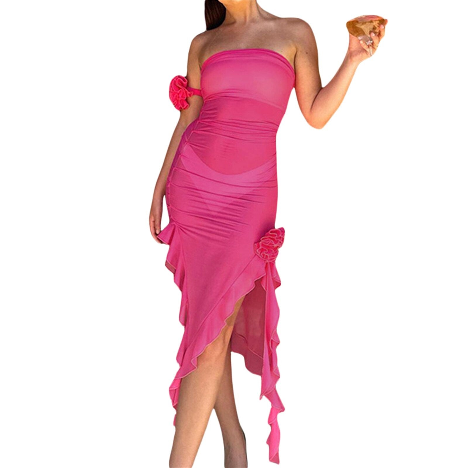 • Women Strapless Ruffle Tube Dress Sexy 3D Floral Irregular Hem Split Bodycon High Slit Backless Party Dress
