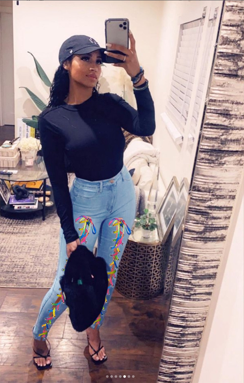 • Sexy Bag Hip Lace Ruffles Patchwork Pockets Low Rise Pencil Jeans Street Push Up Distressed Stretchy Ripped Skinny Denim Pants