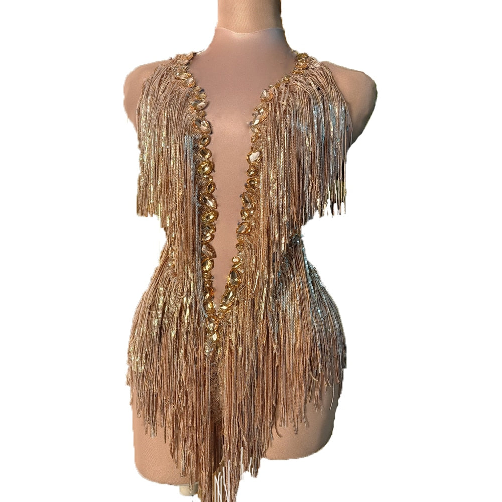 • Sparkly Rhinestones sequin Fringes Leotard Sexy Tassel Bodysuit women gold Latin Dance Costume Stage Dancer DS Performance Show