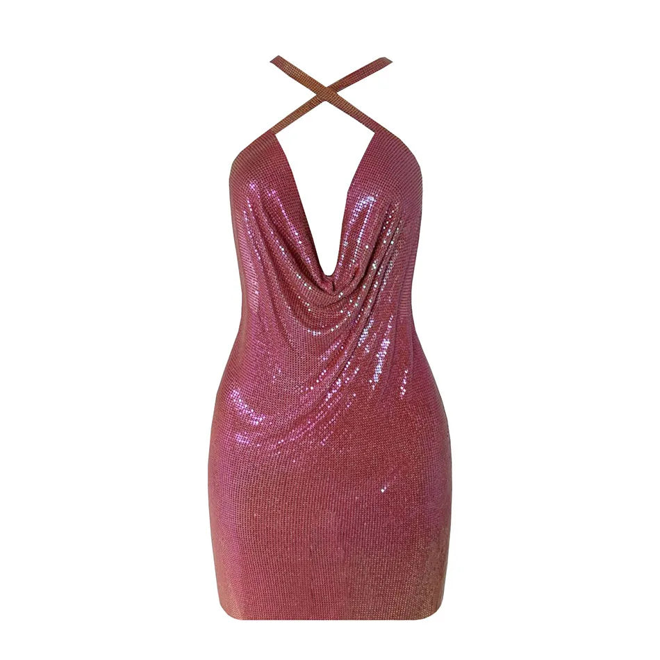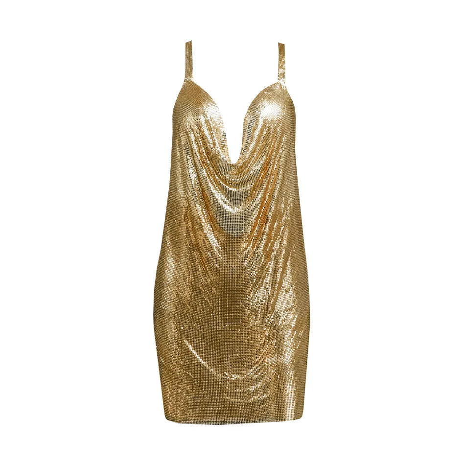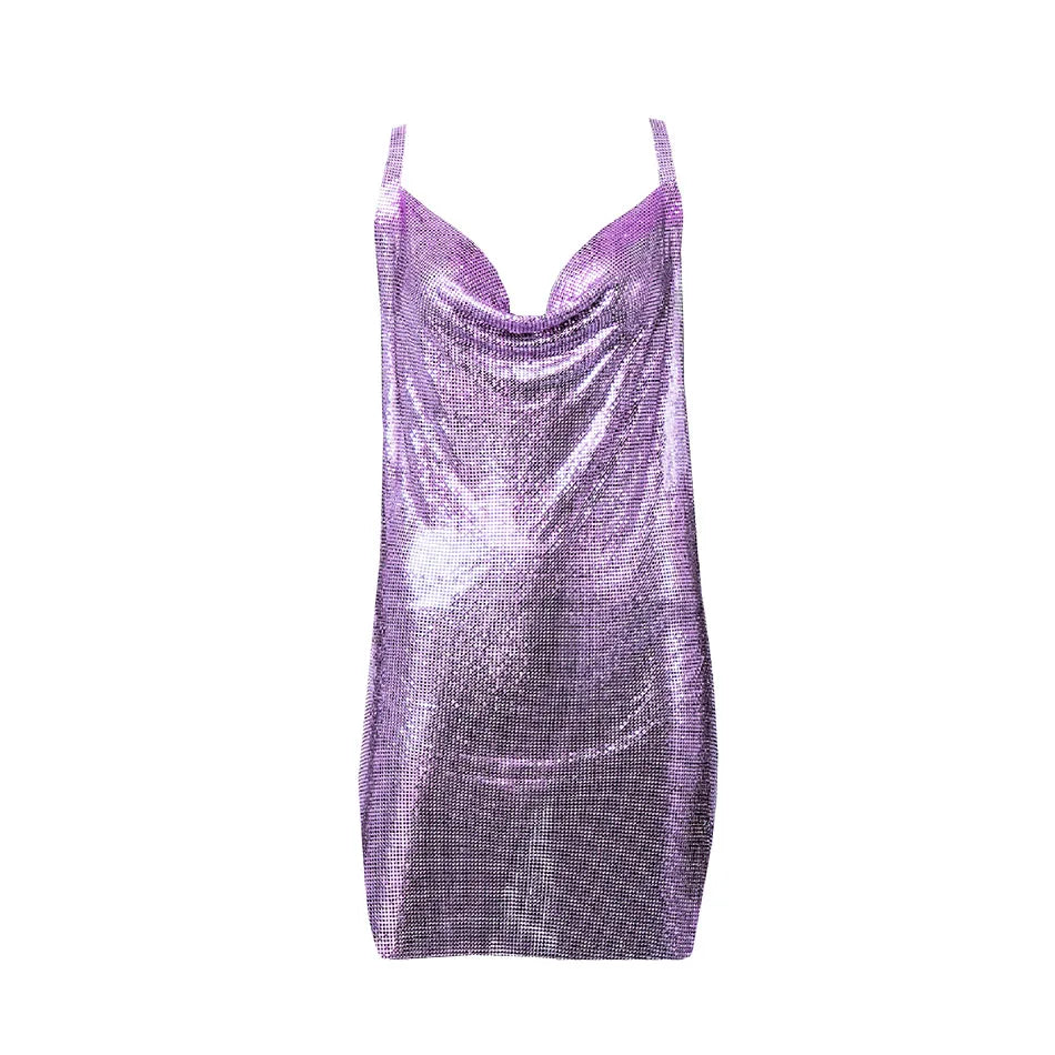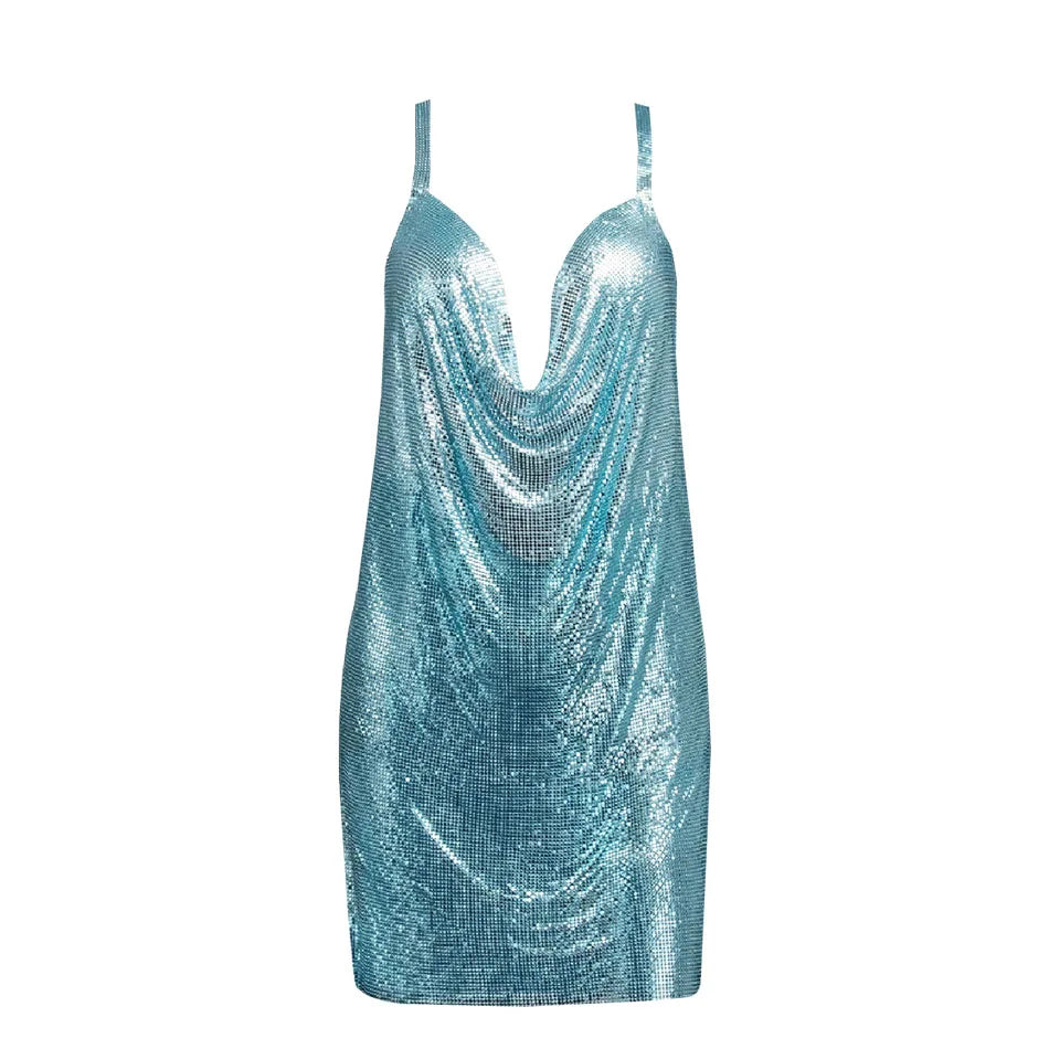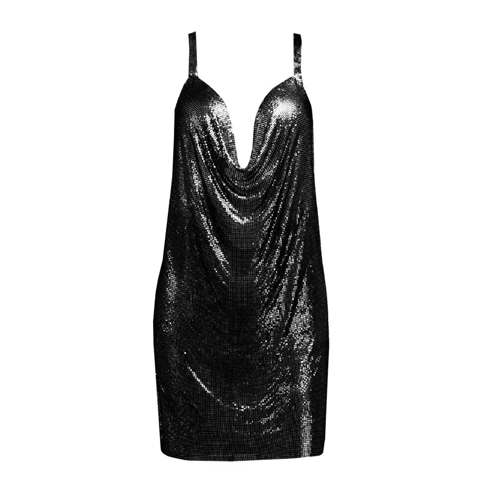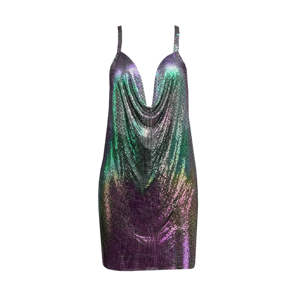 YOUR BUMP CURVE Shiny Cool Metal Sequin V Neck Sleeveless Backless Cross Side Irregular Mini Sexy Ladies Yacht Club Metal Dress
