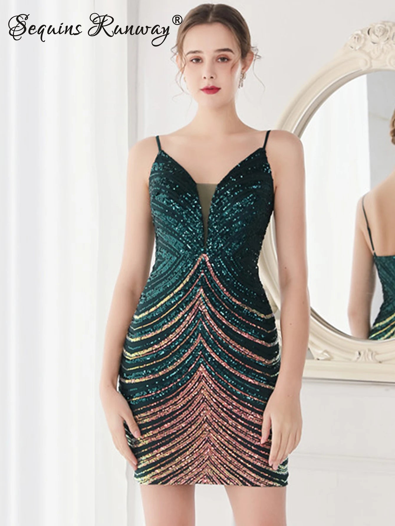 SPECIFICATIONSBrand Name: sequins runwayElasticity: Medium StrecthSleeve Style: Spaghetti StrapFabric Type: POLYESTERHign-concerned Chemical: NonePattern Type: SolidFit Type: SlimSilhouette: SheathNeckline: V-NeckDecoration: SequinedStyle: Sexy & ClubDresses Length: Above Knee,...