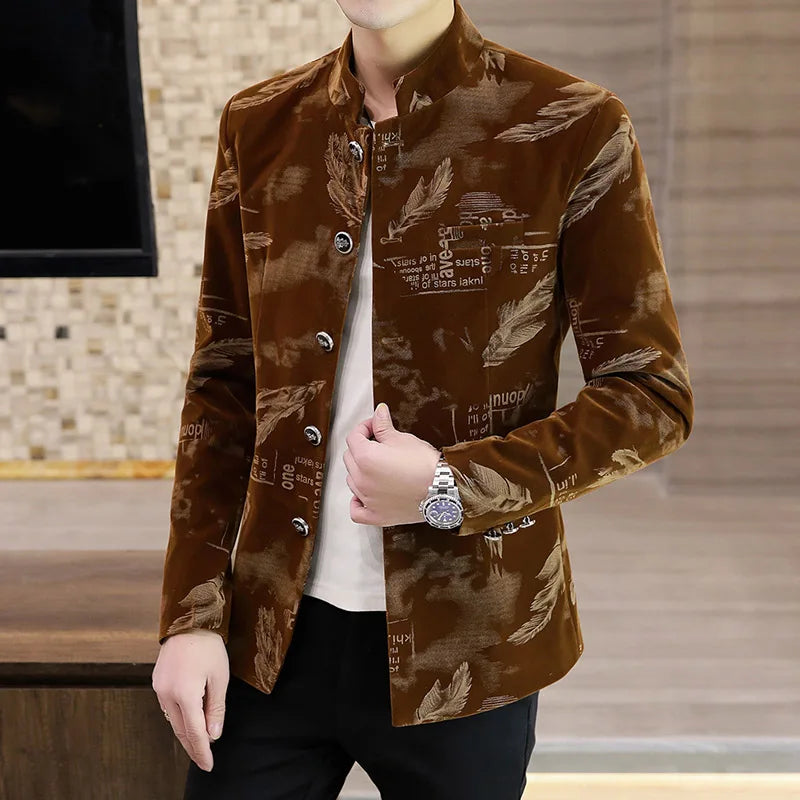 Luxury Retro Velvet Suit Jacket for Men Fashion Slim Fit Stand Collar Blazer Masculino Casual Business Wedding Dress Coat 2023