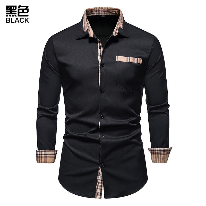 PARKLEES 2023 Autumn Plaid Patchwork Formal Shirts for Men Slim Long Sleeve White Button Up Shirt Dress Business Office Camisas