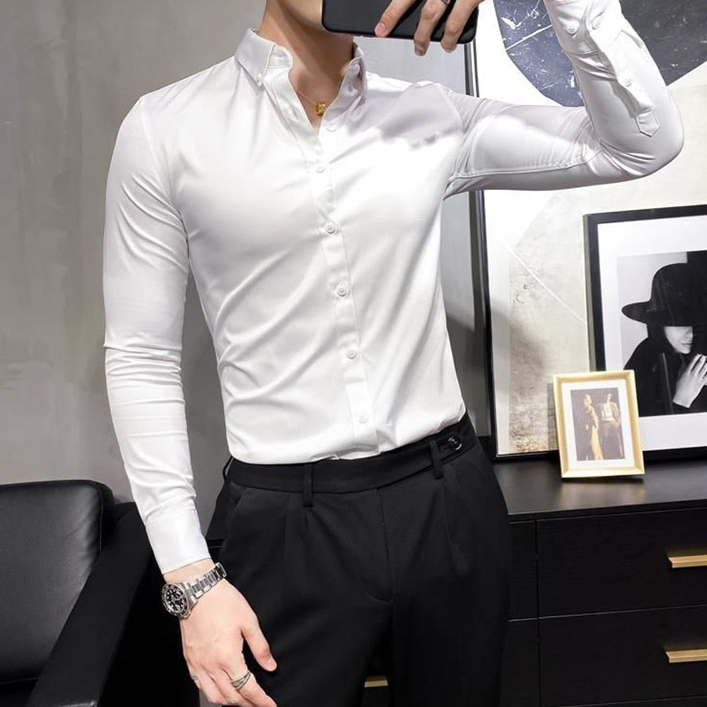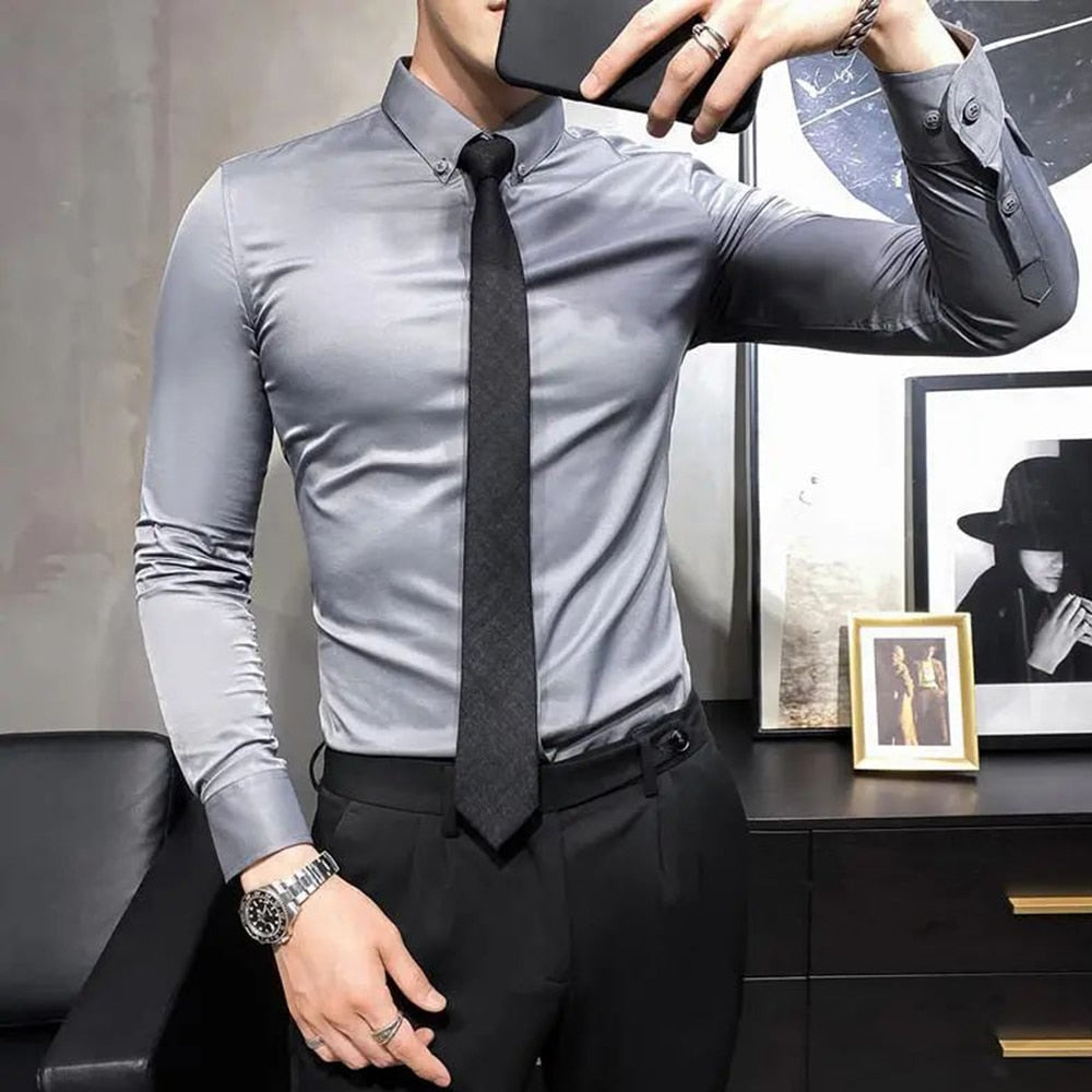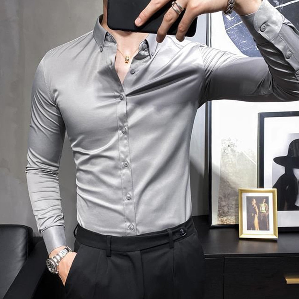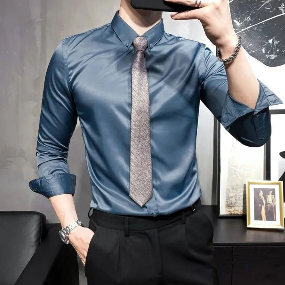 • Italian Gentleman Non-ironing Slim Bright Color Men's Shirt Trendy Silky Satin British Style Formal Shirt Business Elegance