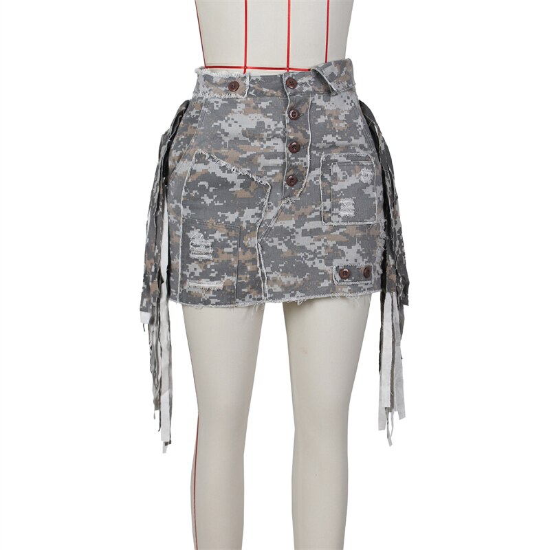 Side Tassel Camouflage Mini Cargo Skirts Women High Waist Buttons Patch Fringed Casual Street Skirt All Matching Skirt