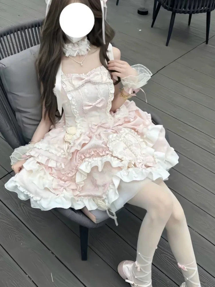 Lovely Kawaii Slash Neck Slim Lolita Dress Women Sweet Design Bow Off Shoulder Sling Dresses Elegant Cute Pretty New Clothing