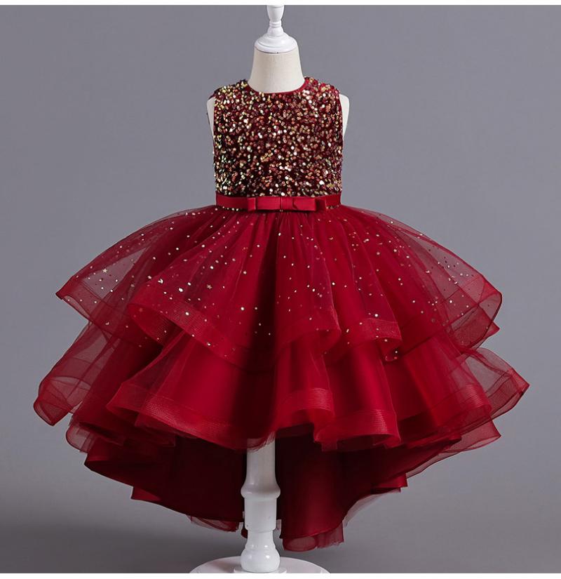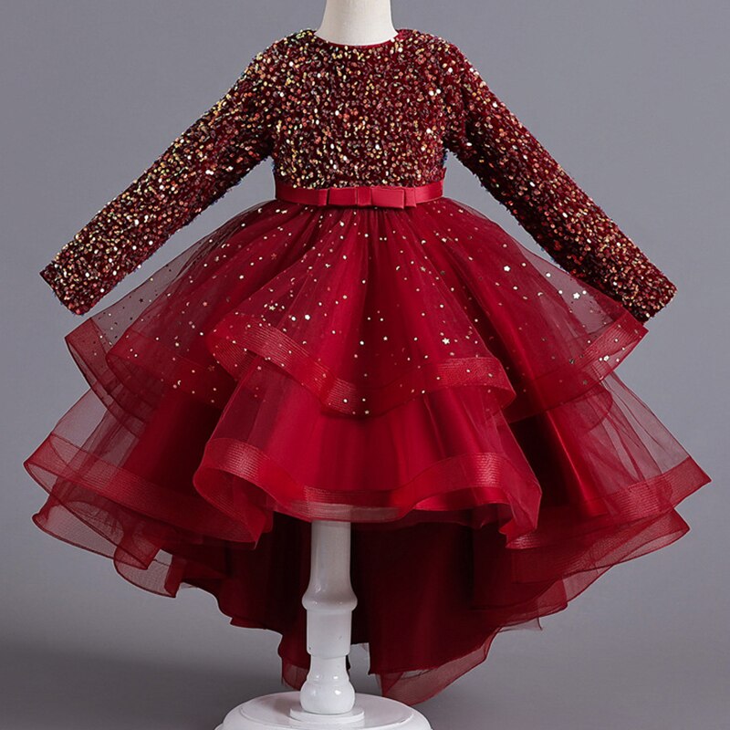 • Formal Bridesmaid Long Sleeve Red Trailing Party Dress For Girls Princess Birthday Sequin Prom Gown Children Evening Kids Clothe