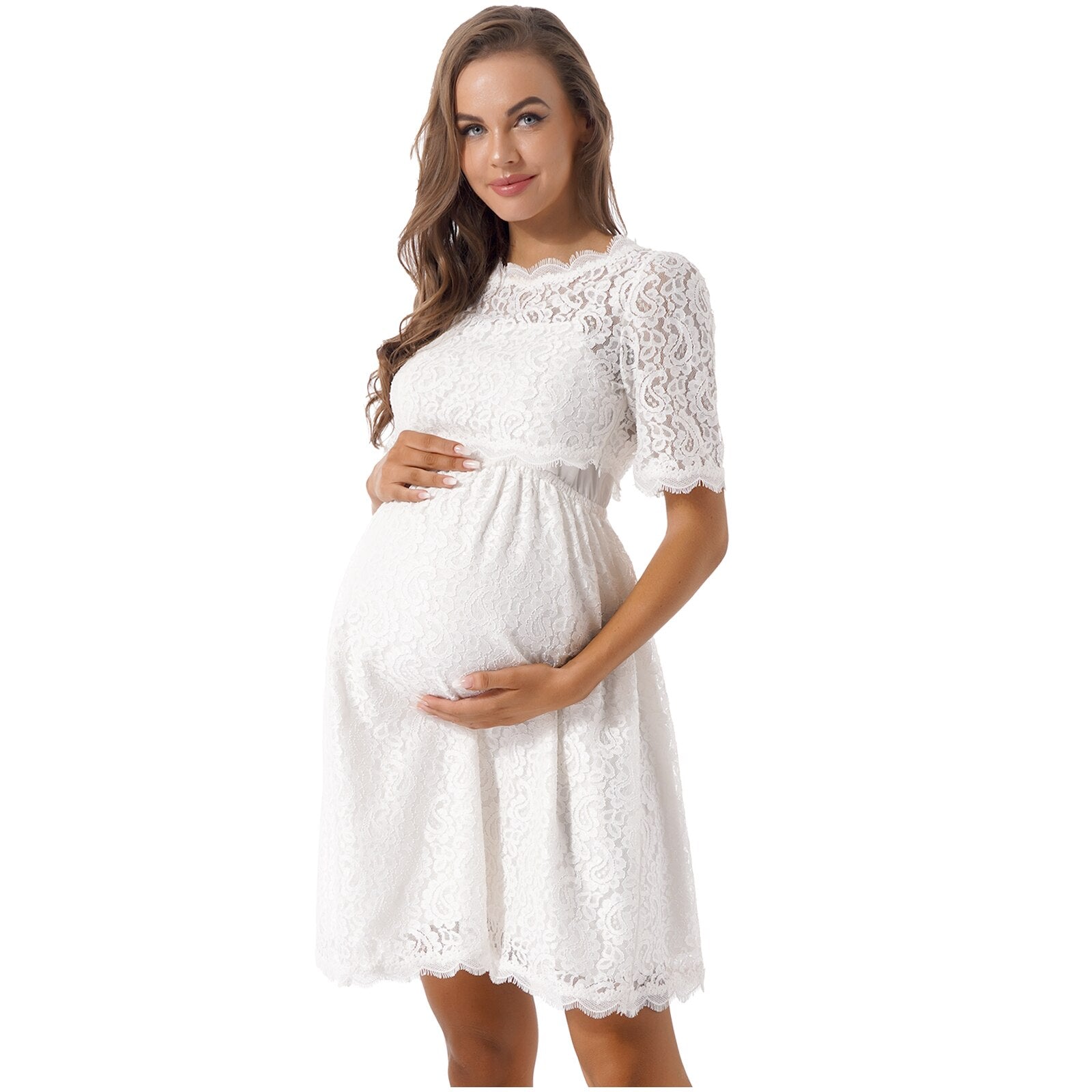 Womens Maternity Elegant Floral Lace Overlay V Neck Half Sleeve Knee Length Pregnant Photography Dress for Formal Evening Party