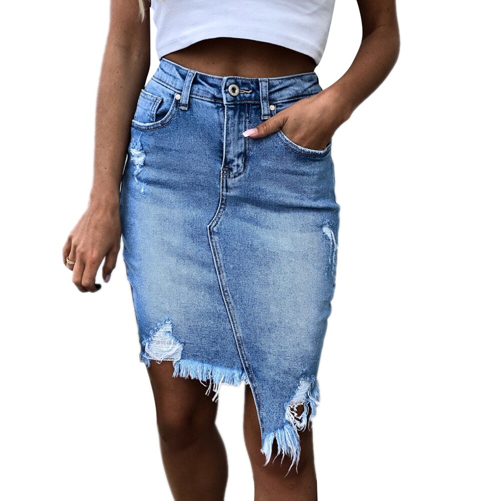 • Women's New High Waist Stretch Ripped Denim Denim Skirts Solid Frayed Holes Bodycon Mini A-line Pencil Skirt Streetwear