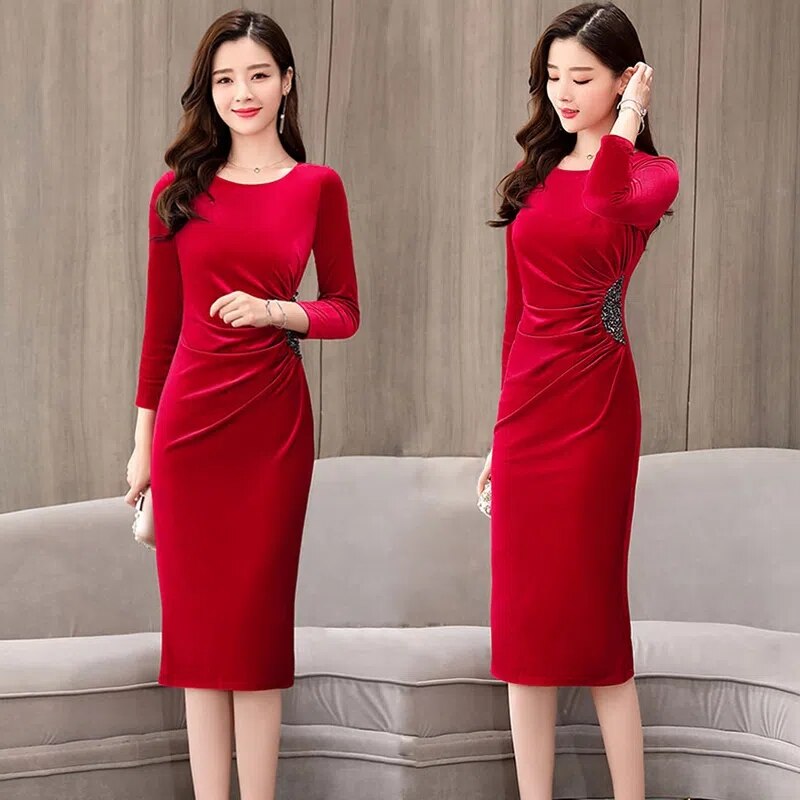 SPECIFICATIONSspring autumn casual dress women: retro mid-length velour dressesgreen/navy blue/black/red dress: M/L/XL/2XL/3XLfashion slim round neck 2023 dress: elegant midi vestidos de mujerWaistline: Natural FactorsType: RegularStyle: Sexy...