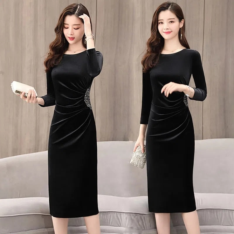• Sexy Slim Pleated Sequin Velvet Dress Women Elegant Long Sleeve Korean Evening Party Dresses Vintage Knee Length Vestido Festa