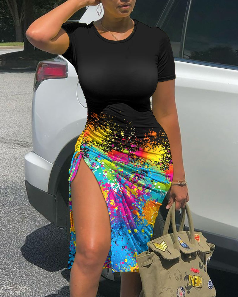 • Sexy Skinny Dress Women Ink Print Short Sleeve Drawstring Ruched Dress Summer Casual Slit Party Dress Loungewear