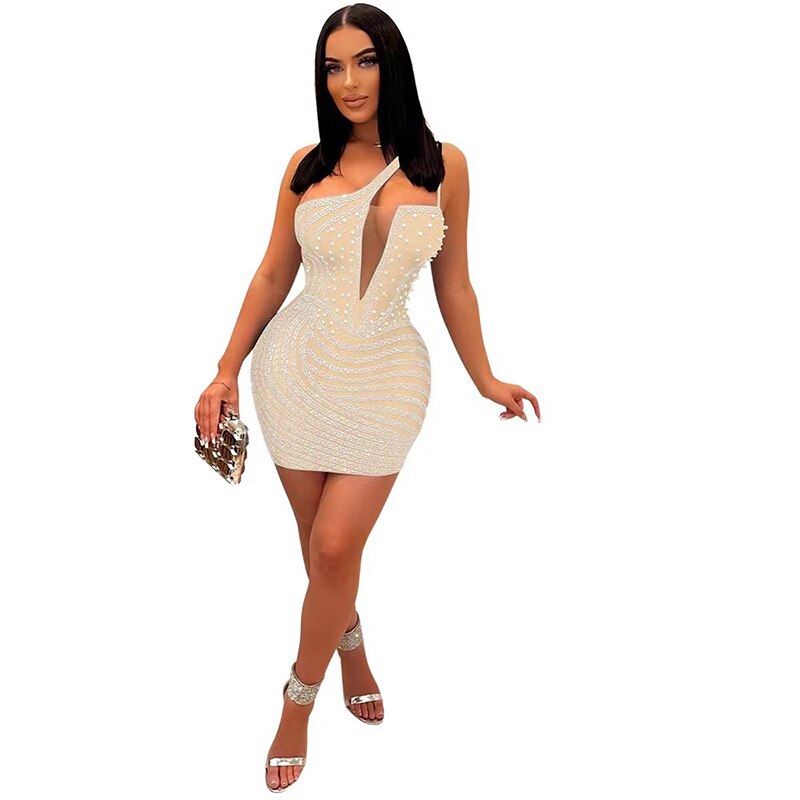 • Sexy Shiny Diamonds One Shoulder Hollow Out Mini Dress