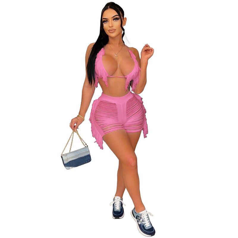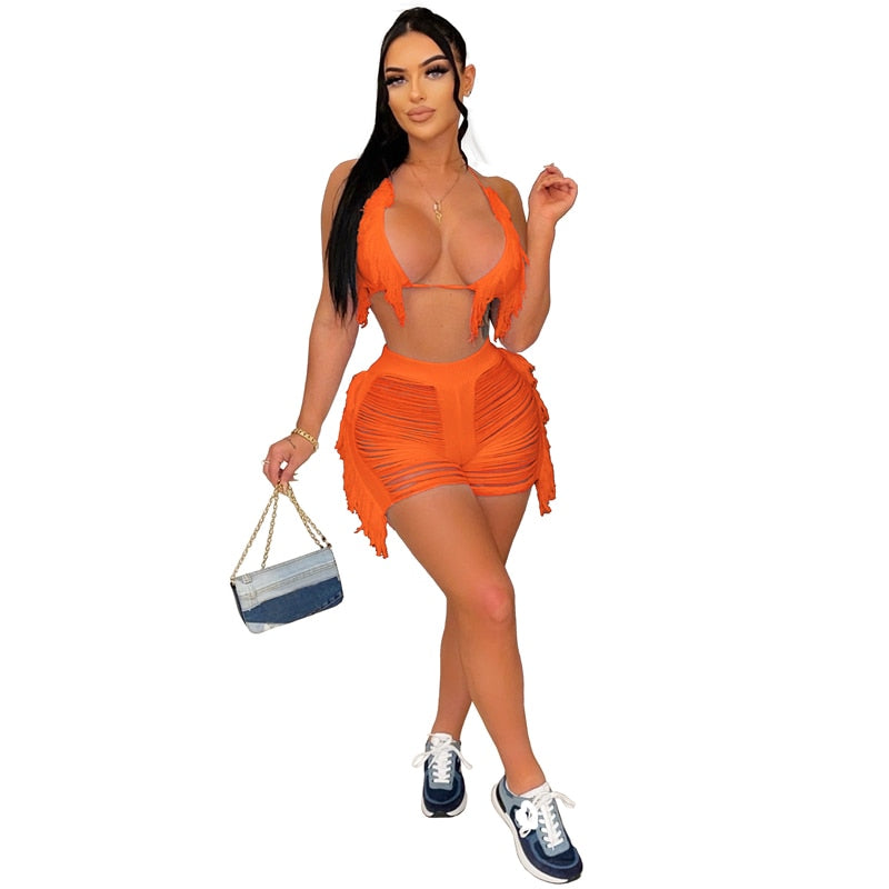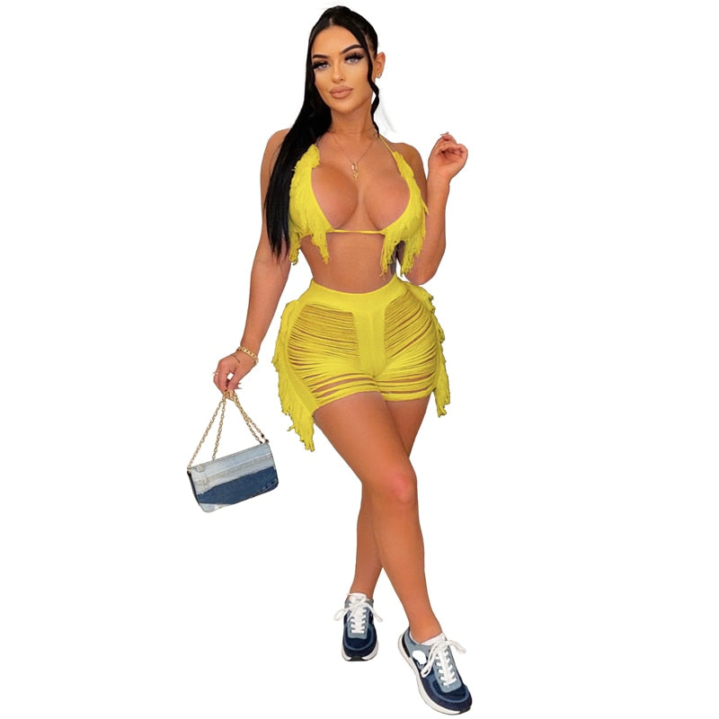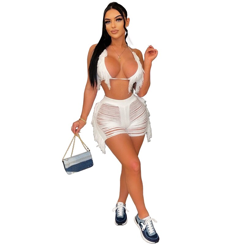 Sexy Women Knitted Set Two Pieces Set Halter Backless Bra Shorts Crocheted tassel Hollow Out Beach Wear cover-ups 2022 New