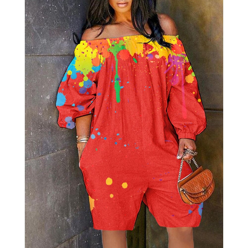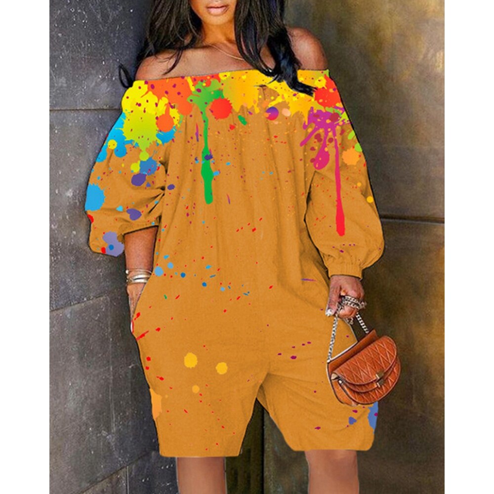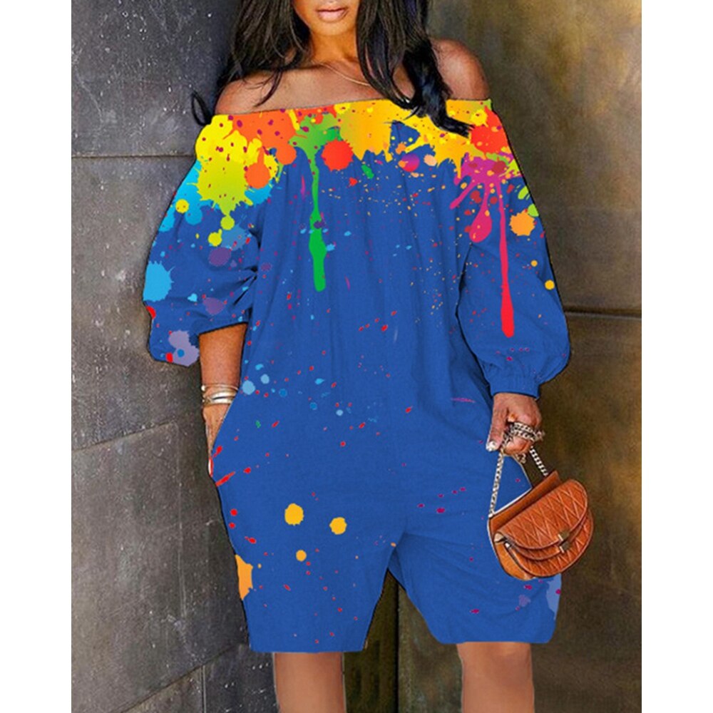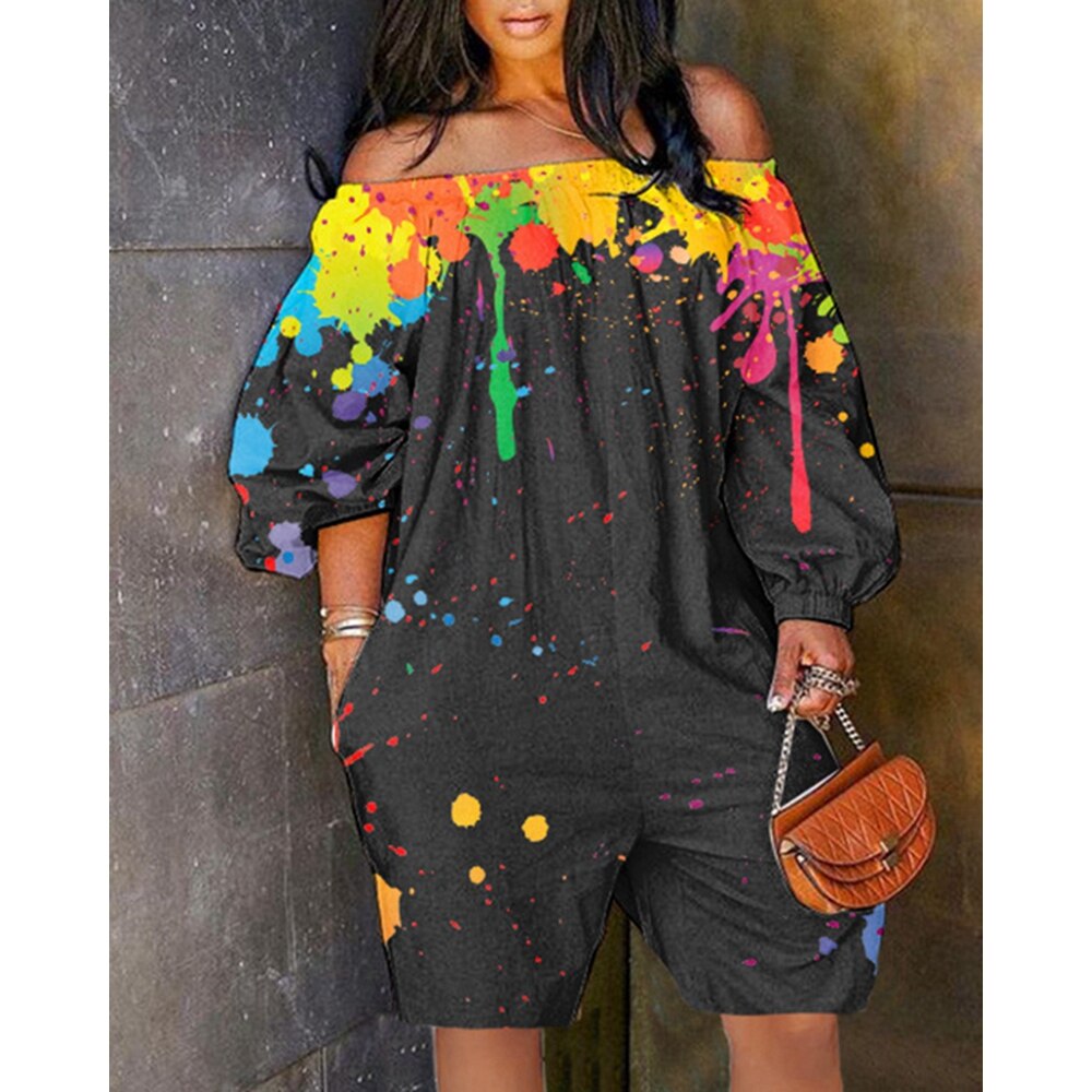 Sexy Women Ink Splash Print Off The Shoulder Long Sleeve Romper Oversized