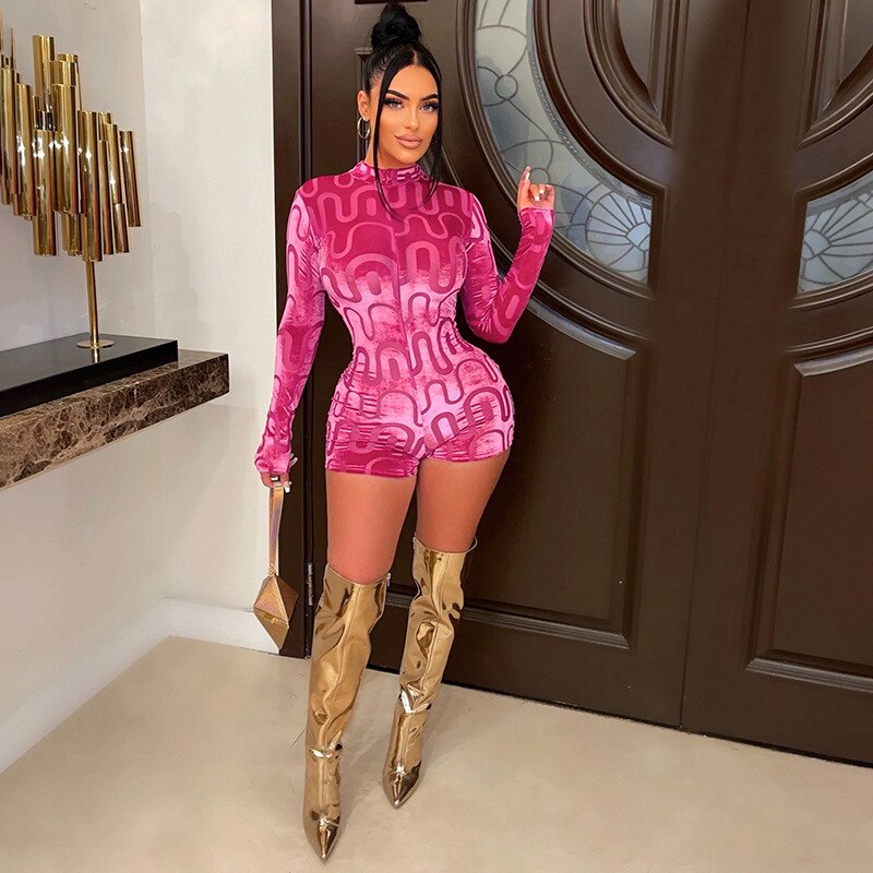 Simenual Woman Printing Velvet Romper Autumn Winter Long Sleeve Hipster Tight-fitting Playsuit Casual Gym Fitness Catsuit Ladies