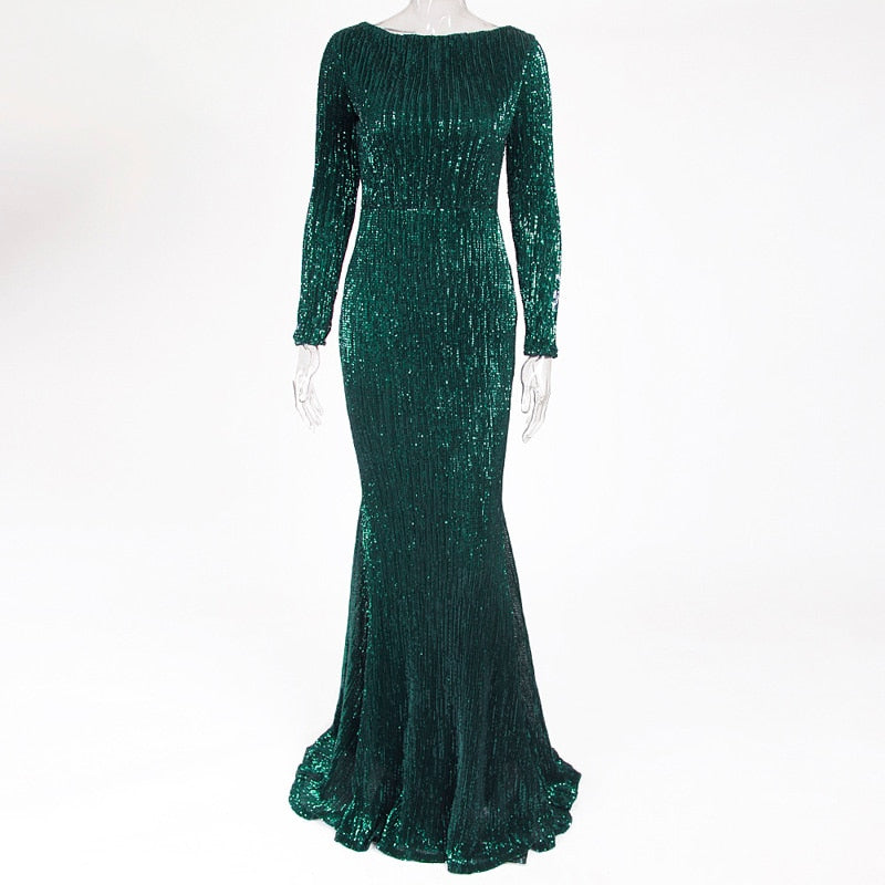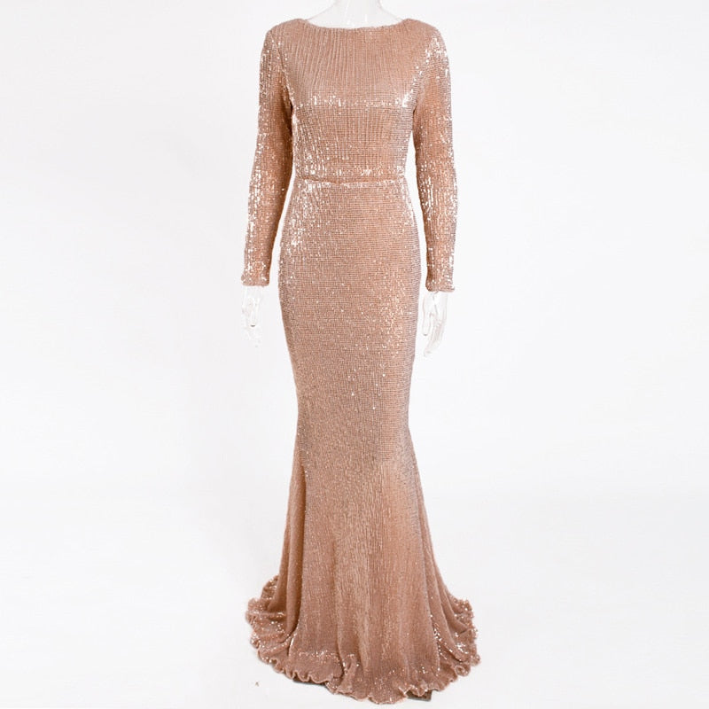• Enenthelabel O Neck Full Sleeved Maxi Dress Stretch Sequined Floor Length Evening Party Dress