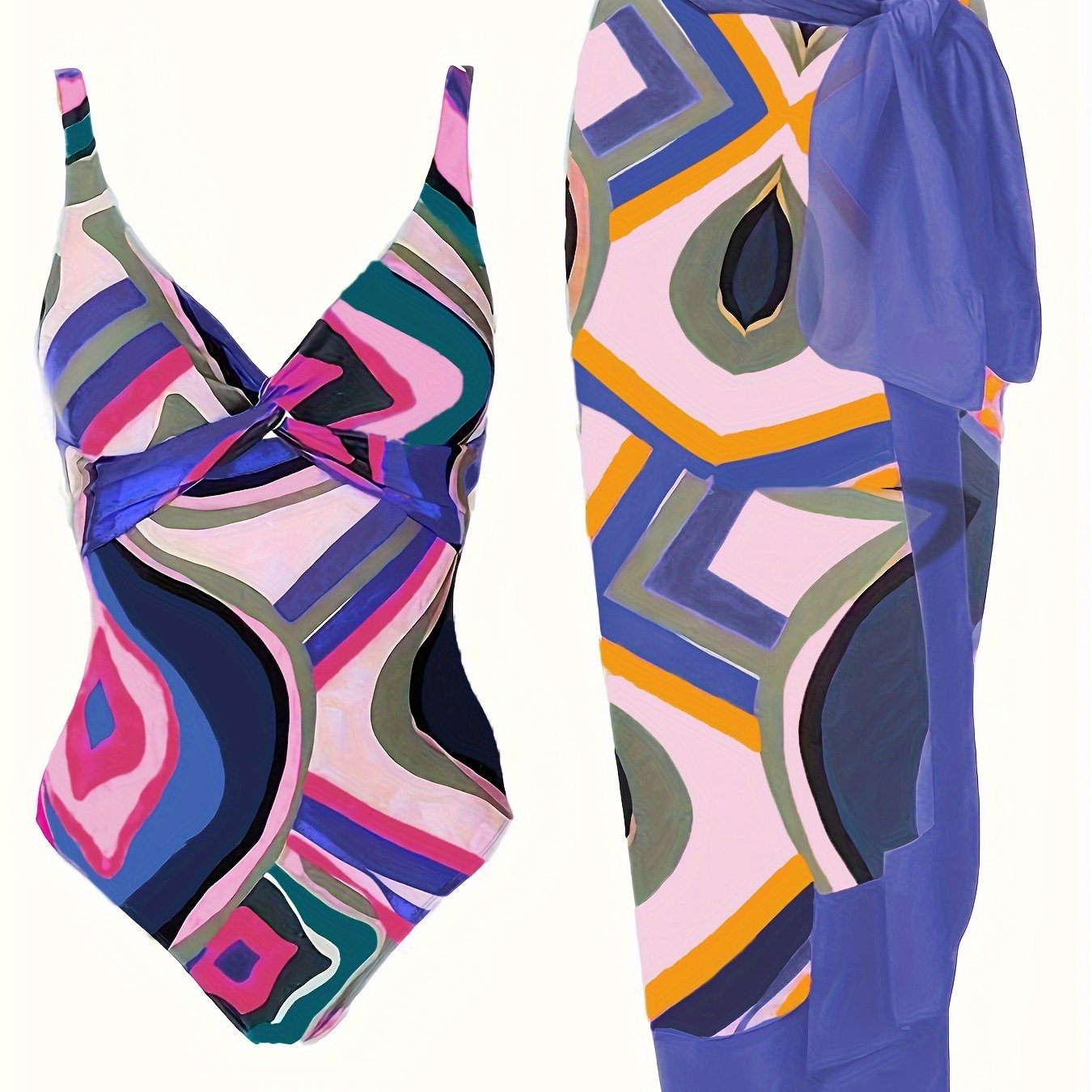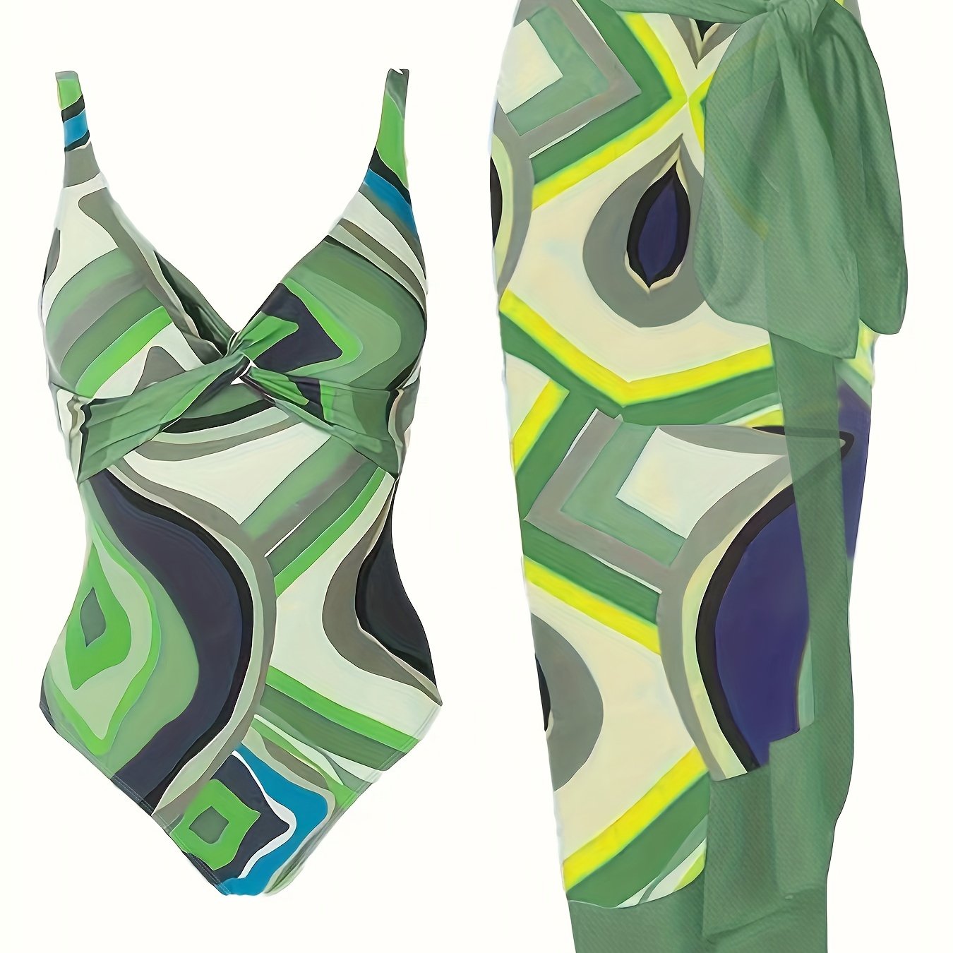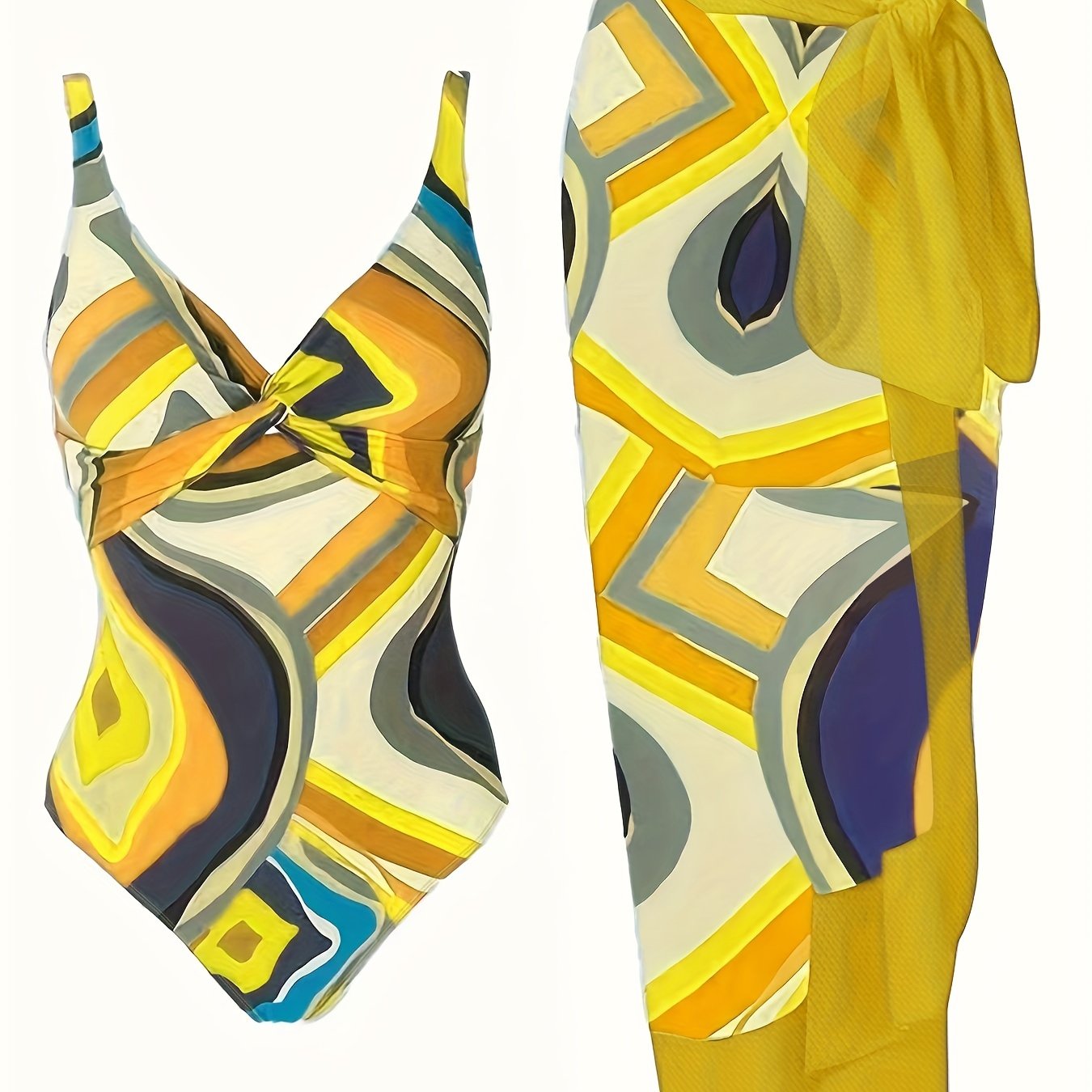 Plus Size Elegant Tankini Set, Women's Plus Geo Print Twist Front One Piece Swimsuit & Knot Side Cover Up Skirt Bathing Suit 2 Piece Set