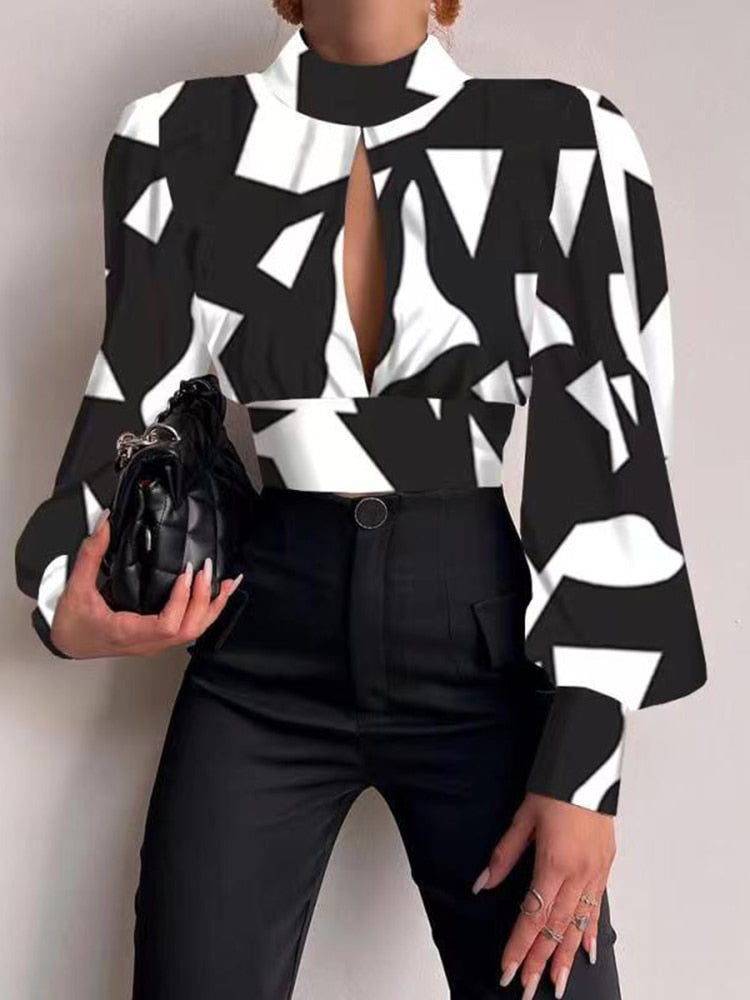 Women Sexy Backless Hollow Print Shirts Fashion Party Crop Top 2023 Spring Casual Stand Long Sleeve Office Lady Blouses And Top