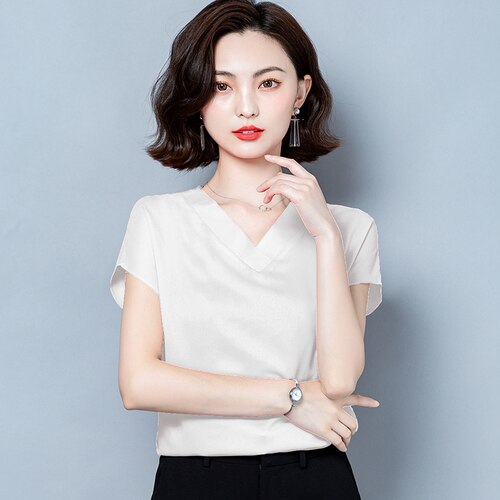 Office Lady Solid V-neck Blouse Women Summer 2023 Short Sleeve Casual Silk Satin Shirts Casual M-4XL Loose Tops Clothes 10297