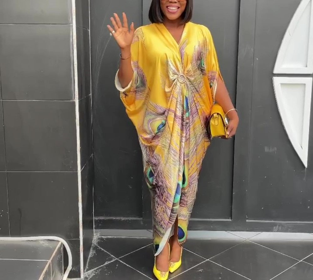 Summer African Printed Maxi Dress Women Causal V Neck Flare Ruffle Sleeve Loose Fit Ruched Front Slit Party Club Long Dress