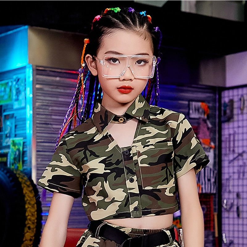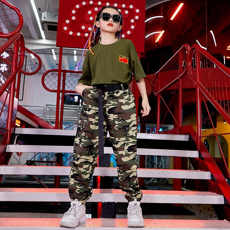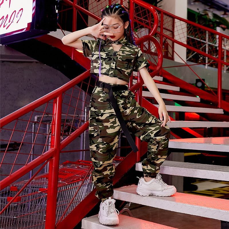 New Hip Hop Girls Clothes Short Sleeve Camouflage Suit Hiphop Pants Boys Street Dancewear Camp Military Training Clothing BL4410