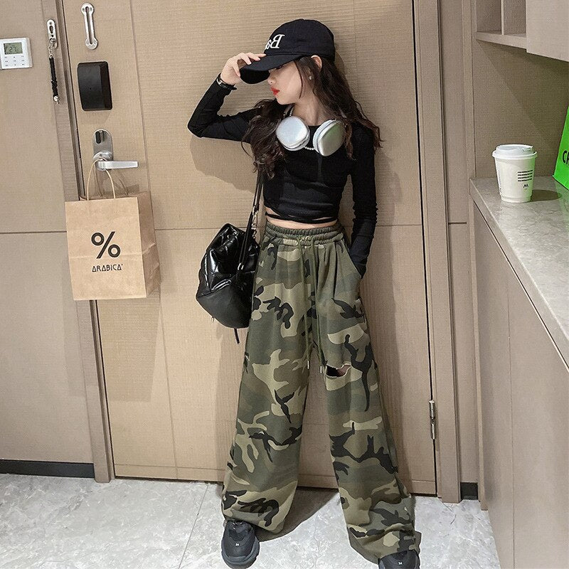 Girls Set Slim Tops Ripped Camouflage Pants Dance Two Piece Autumn Teenager Kids Sportswear 12 13 14 Years Children's Clothing