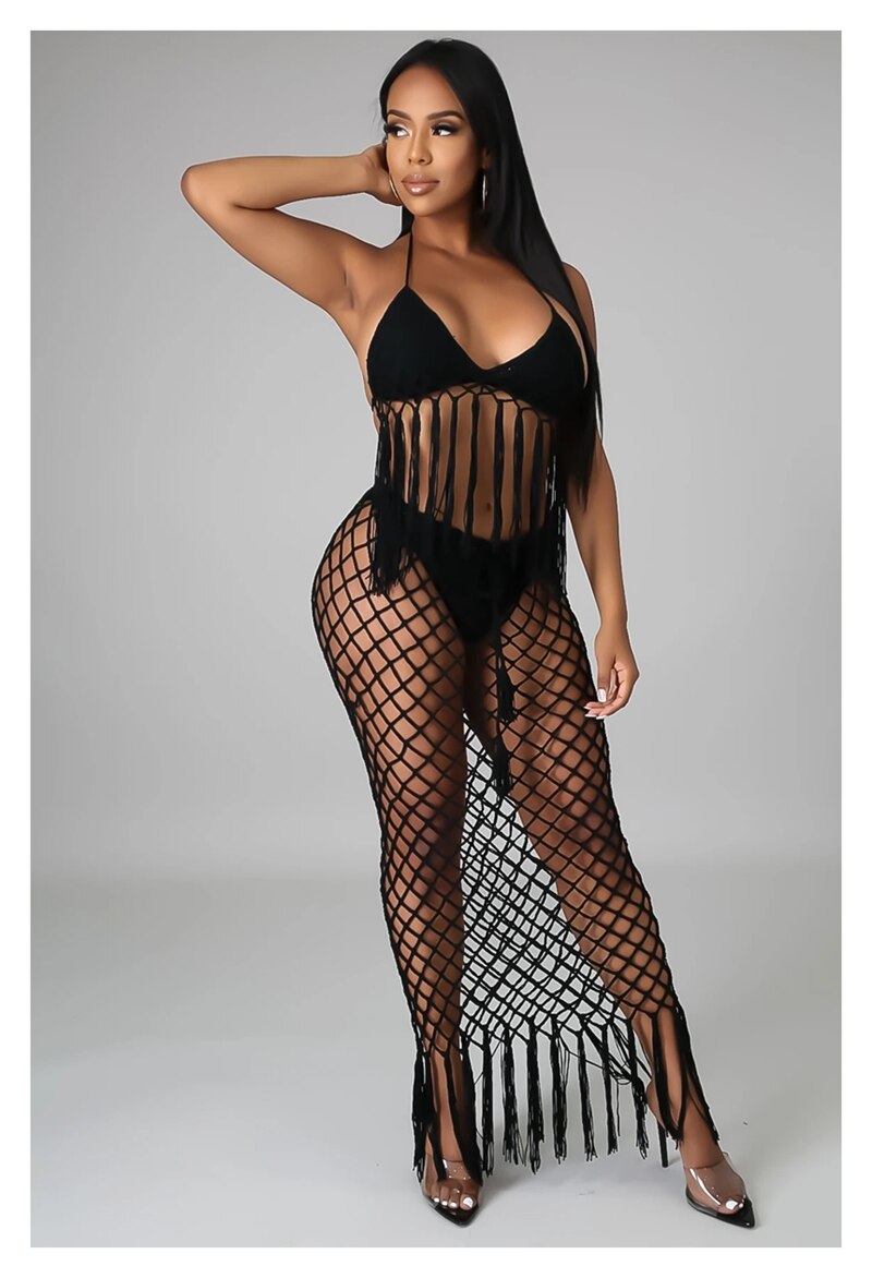 Slash Neck Solid Tops Swimsuit Cover Ups 2 Piece Set Sexy Holiday Women Hand Crochet Ruffles Tassel Knitted Beach Maxi Dress