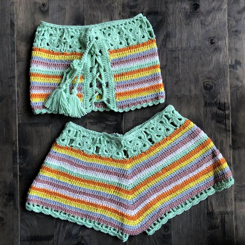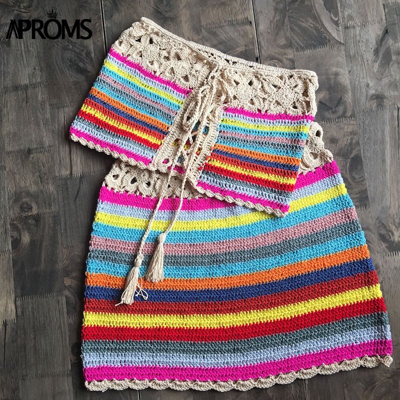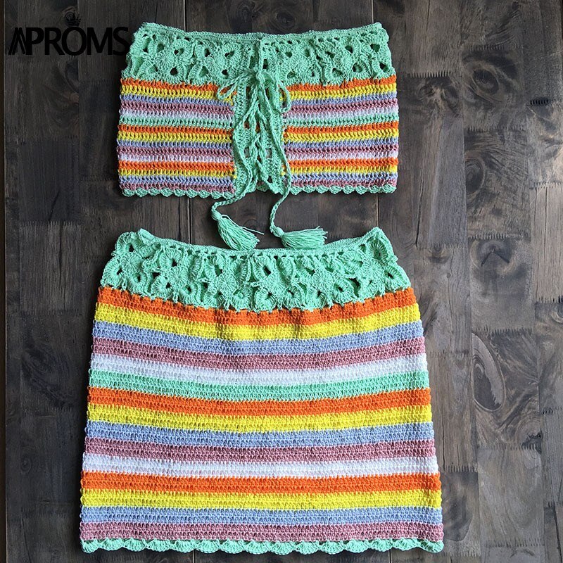 Sexy Colorful Striped Strapless Crochet Tube Crop Top and Skirt Summer Beachwear 2 Piece Set