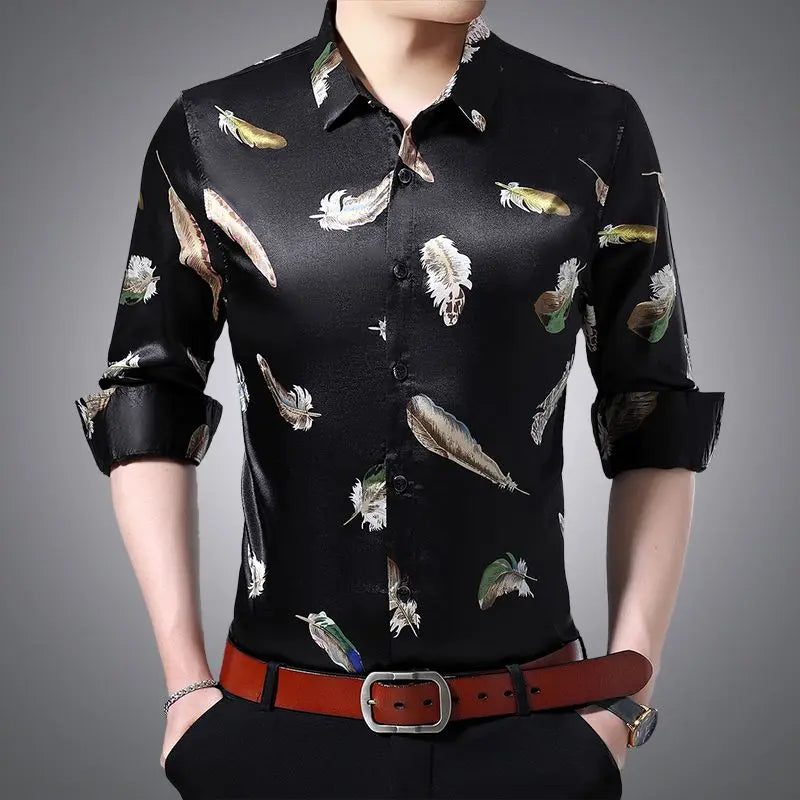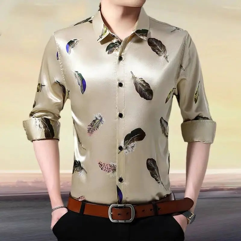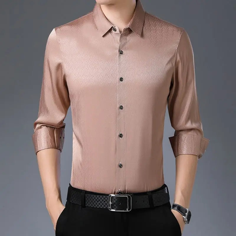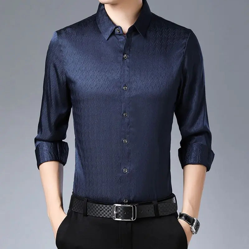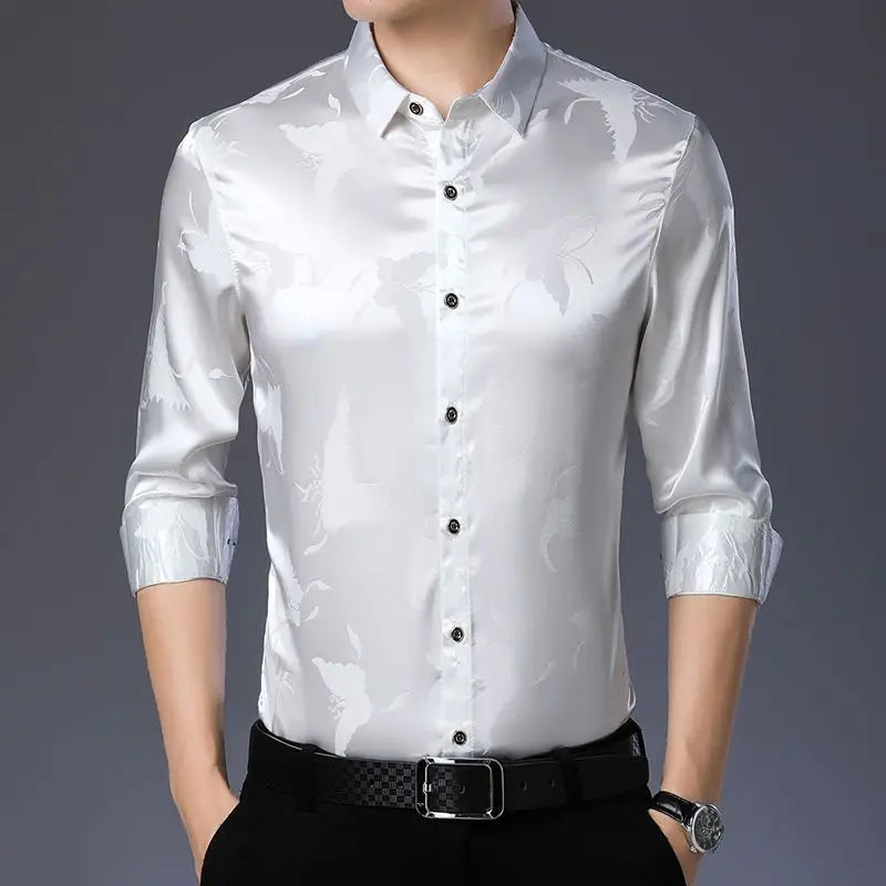 Streetwear Fashion Men Silk Smooth Shirt Spring Autumn New Male Clothes Business Casual Vintage Long Sleeve Basic Casual Tops
