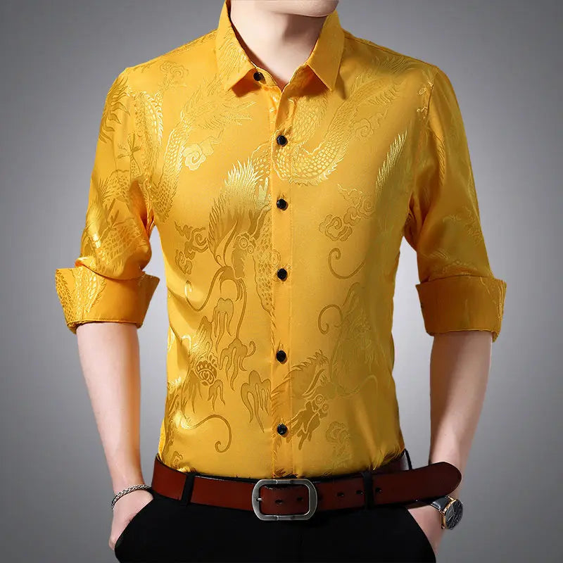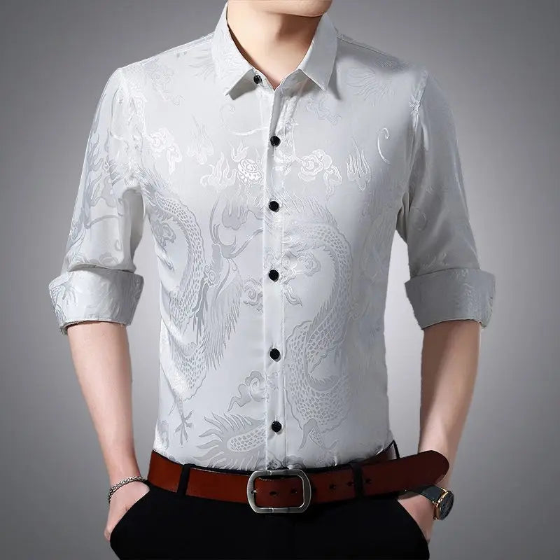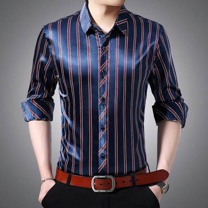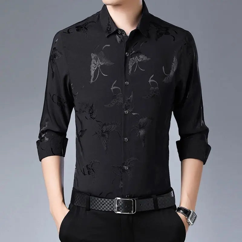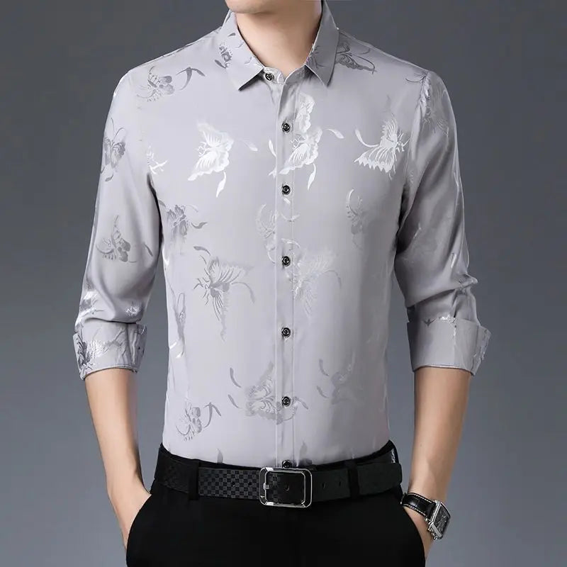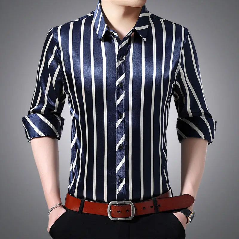 Streetwear Fashion Men Silk Smooth Shirt Spring Autumn New Male Clothes Business Casual Vintage Long Sleeve Basic Casual Tops