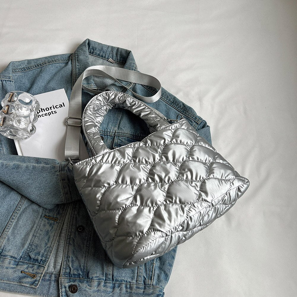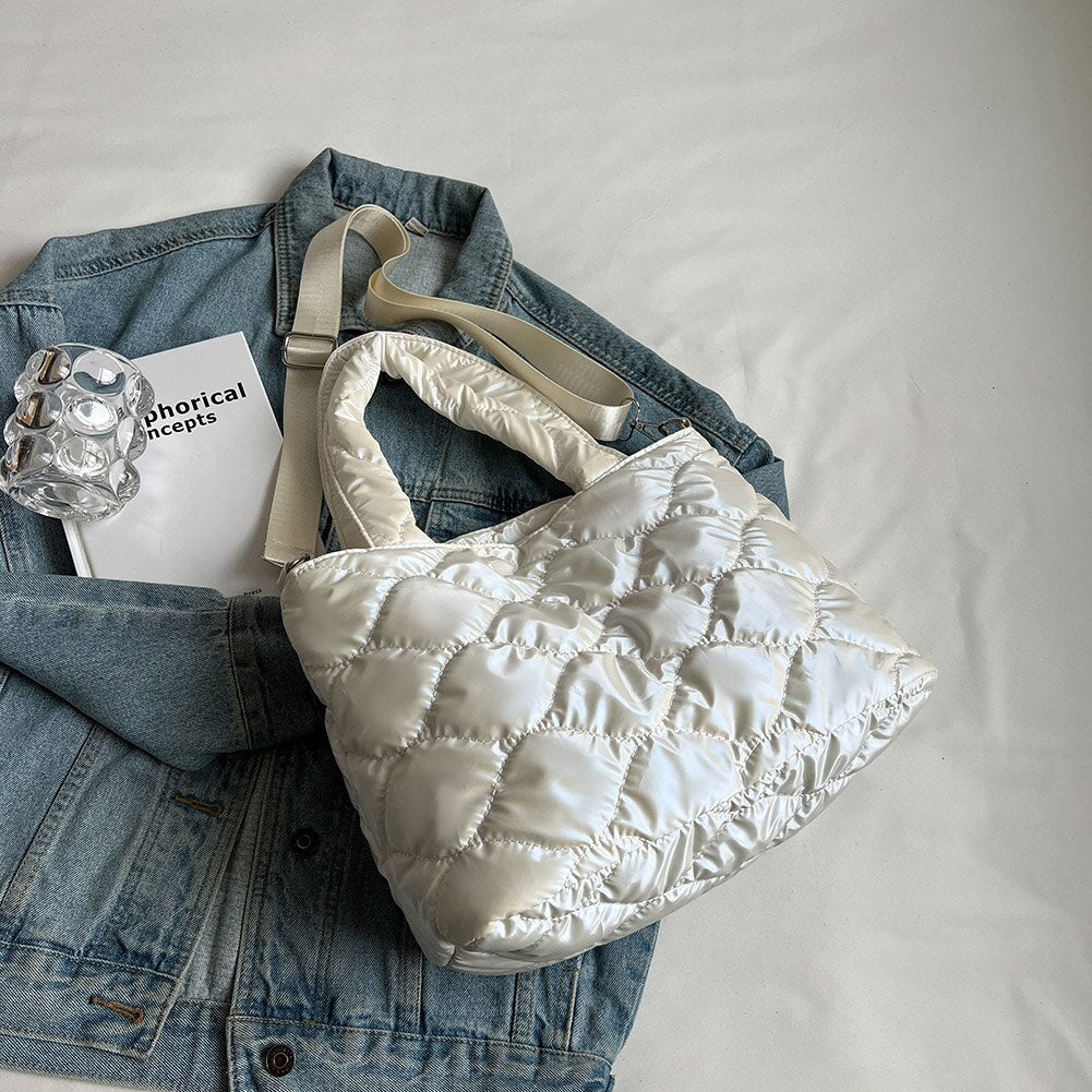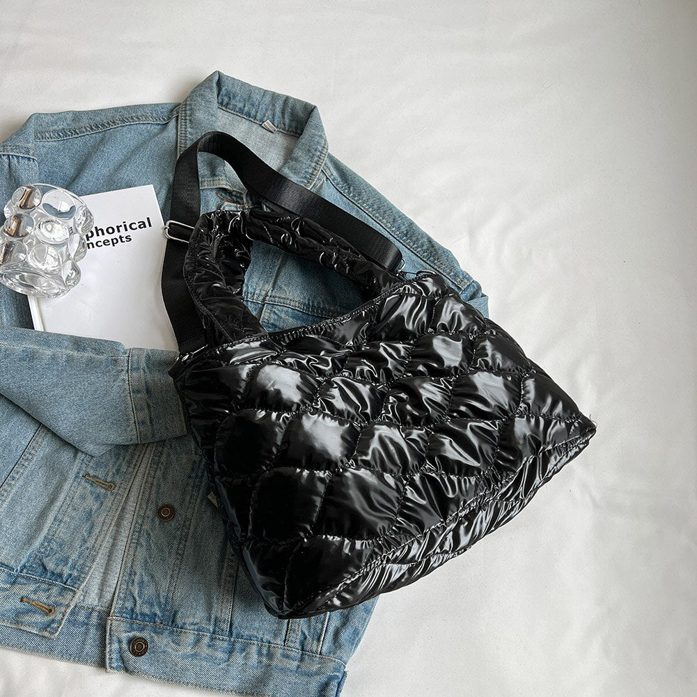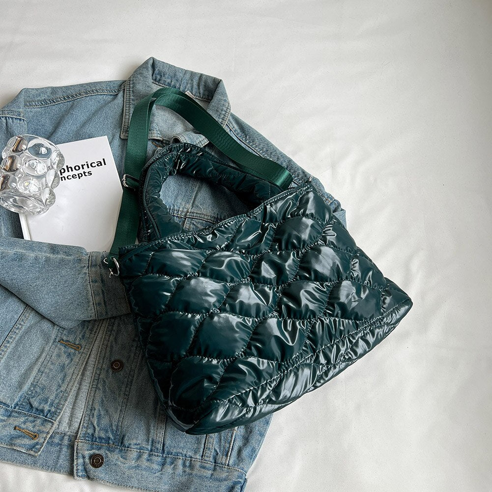 • Women Messenger Bag Solid Color Nylon Cotton-padded Female Down Bags Casual Zipper Winter Fashion Quilted Ladies Large Tote