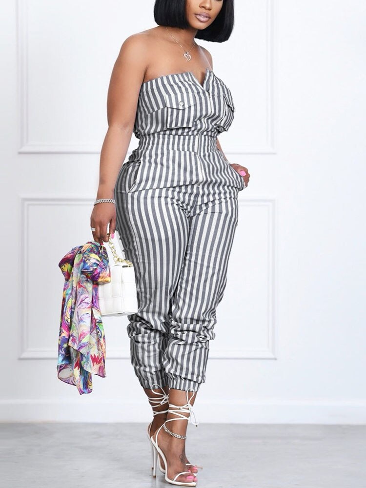 • Women Casual Striped Jumpsuit Slim Zipper Front Tube Jumpsuit Overalls