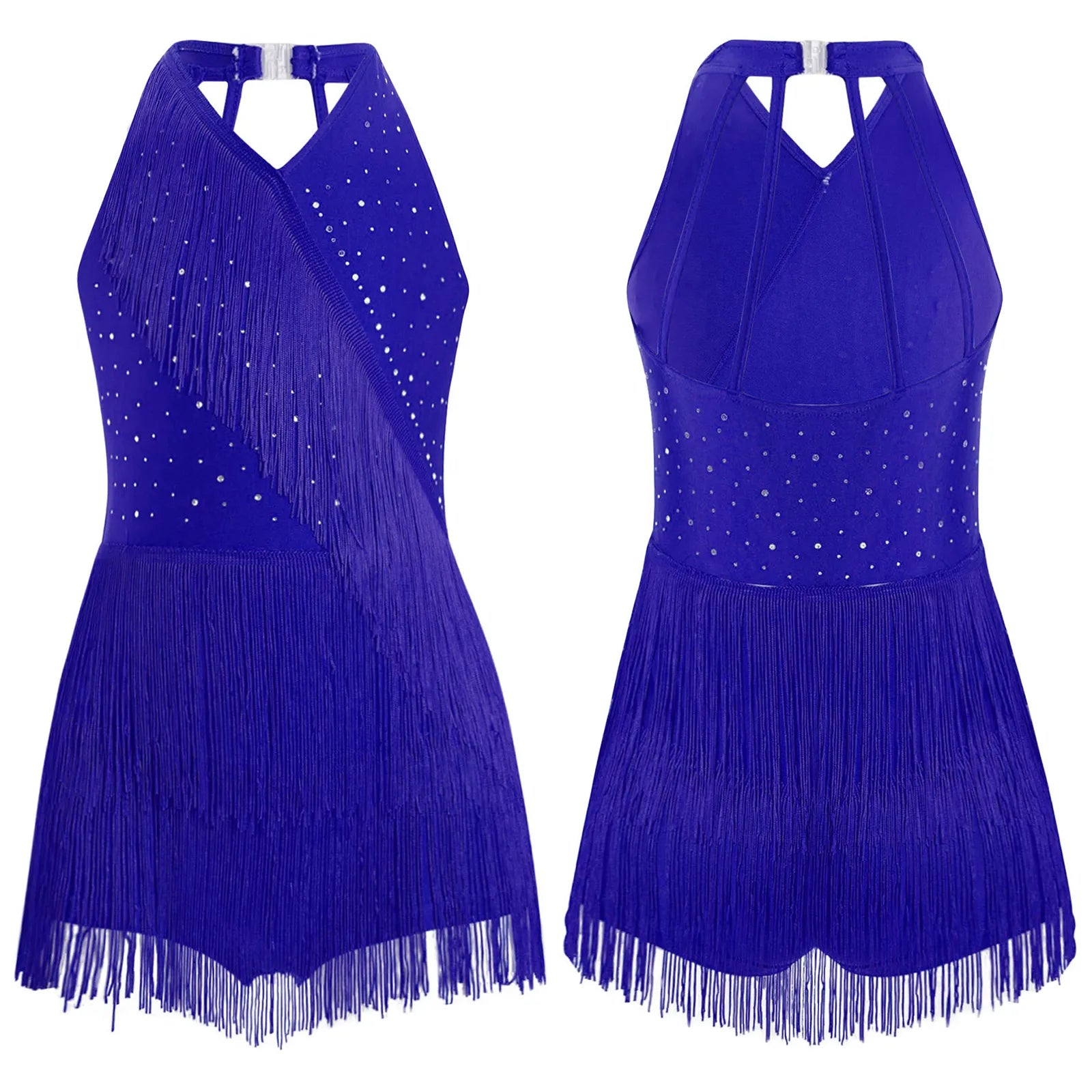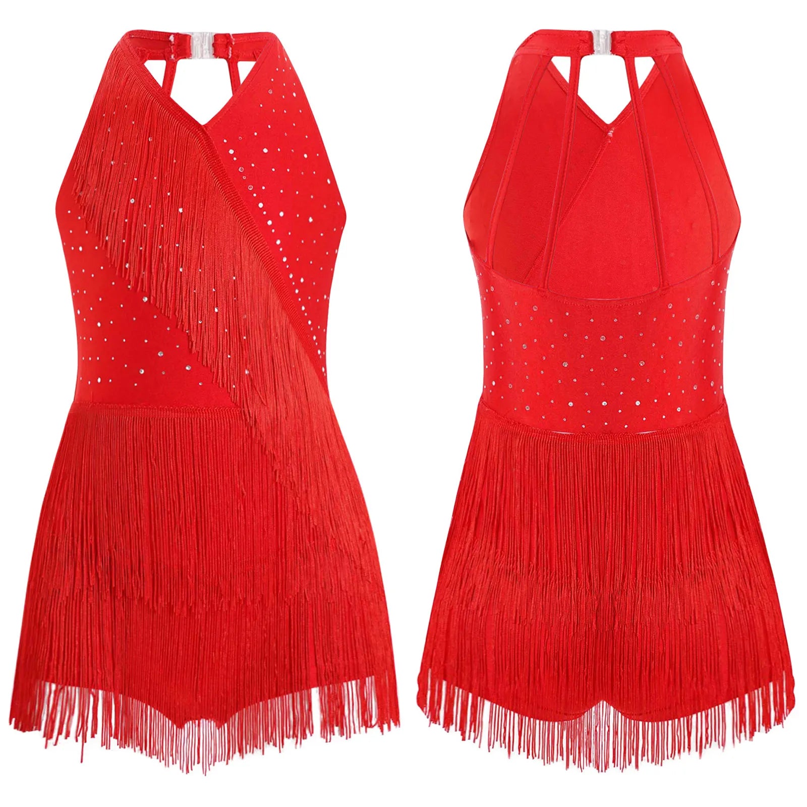 Kids Girls Latin Dance Cha-cha Samba Salsa Costume Rhinestones Fringe Leotard Dress Sleeveless Strappy Back Tassel Jumpsuit