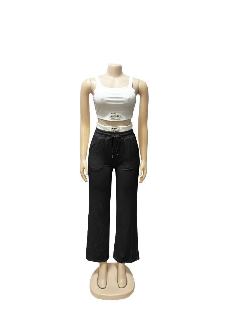 • Letter Print Label Color Patchwork 2 Piece Set Women Tracksuits Ribbed Tank Crop Top + Drawstring High Waist Wide Leg Pants Suit