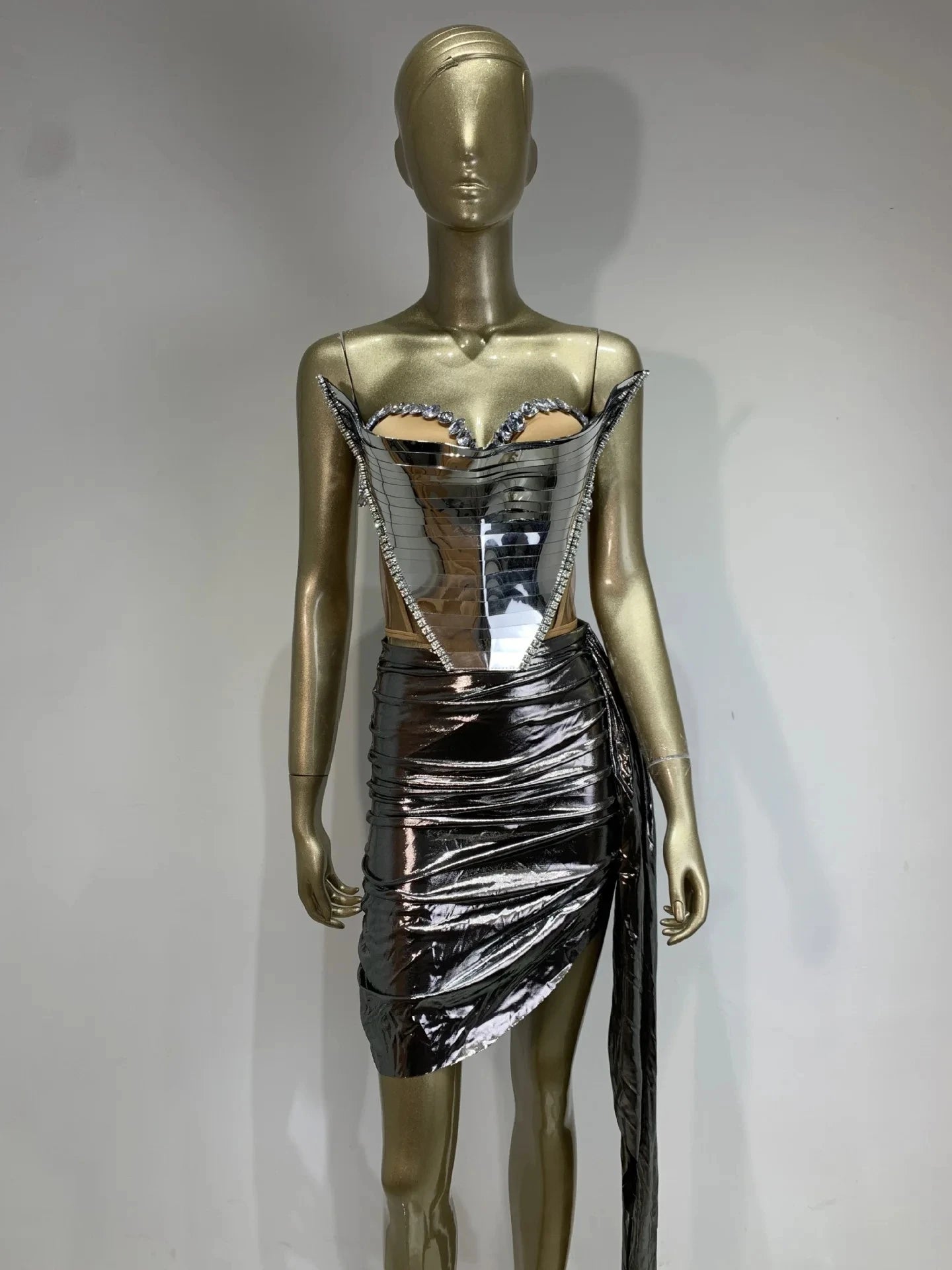 Women Baddie Outfit Gold Silver Two Pieces Skirt Sets Special Occassion Y2K Topic Evening Party Club Nightwears Stage Costumes