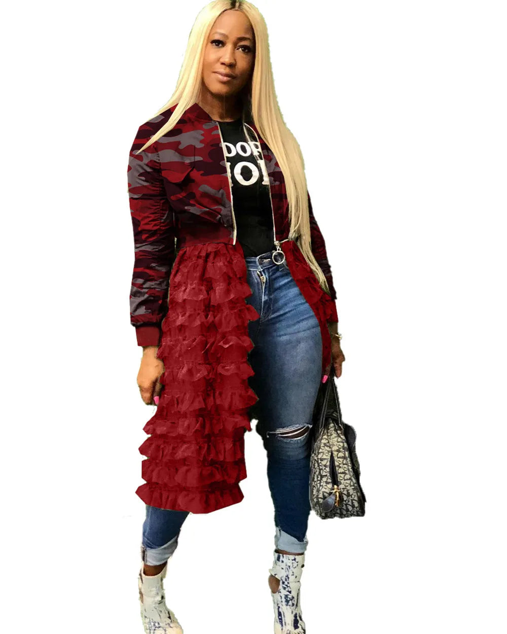 Camouflage Bomber Jacket Women Autumn Winter Streetwear Harajuku Jackets Layered Ruffle Long Coat Outwear Chaquetas