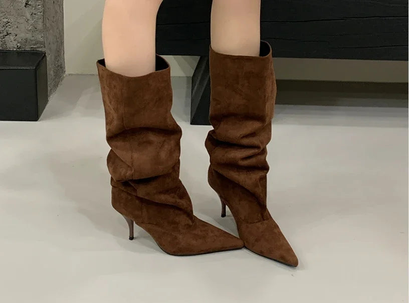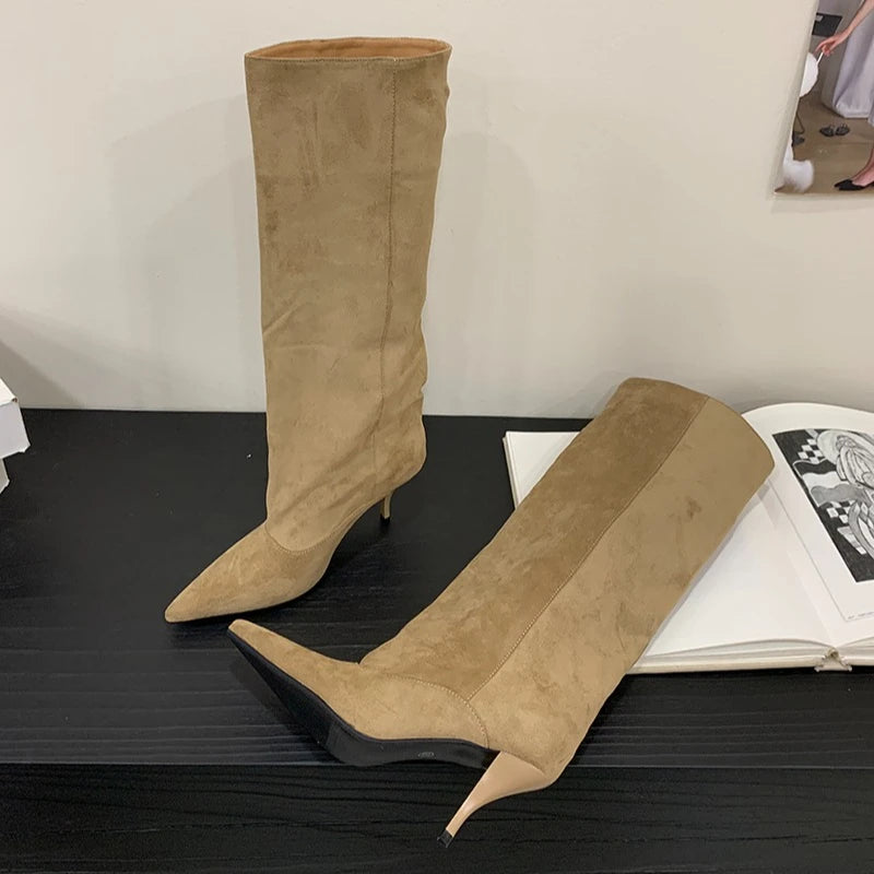 Aneikeh Autumn Winter Fashion Long Booties Shoes Thin Heels Concise Pointed Toe Pleated Knee-High Boots WomenZapatos De Mujer