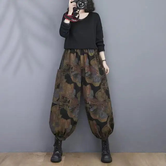 New Fashion Ladies Printed Floral Jeans Women Vintage Blue Denim Pants Female Street Style Oversized Bloomers Pantalons 2024