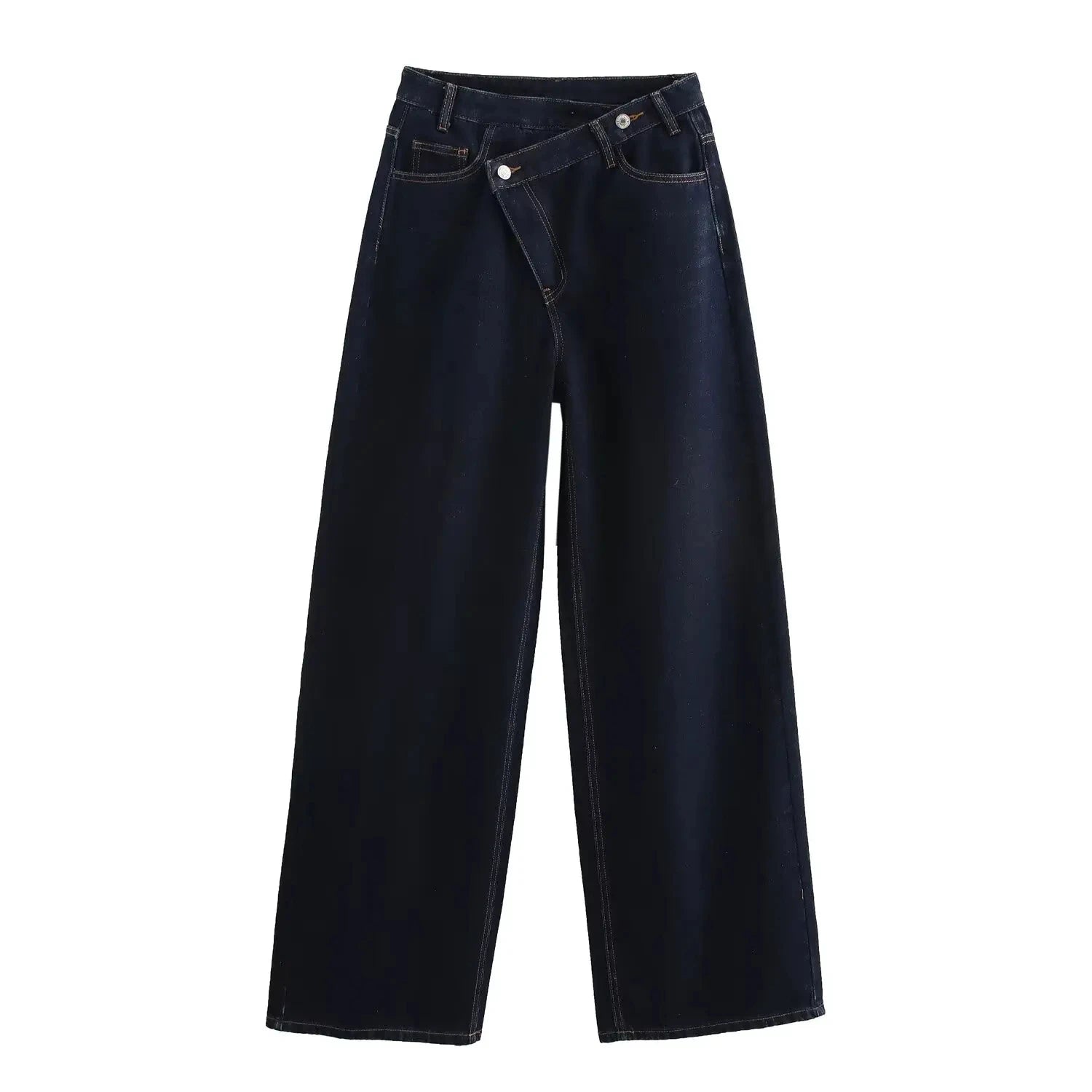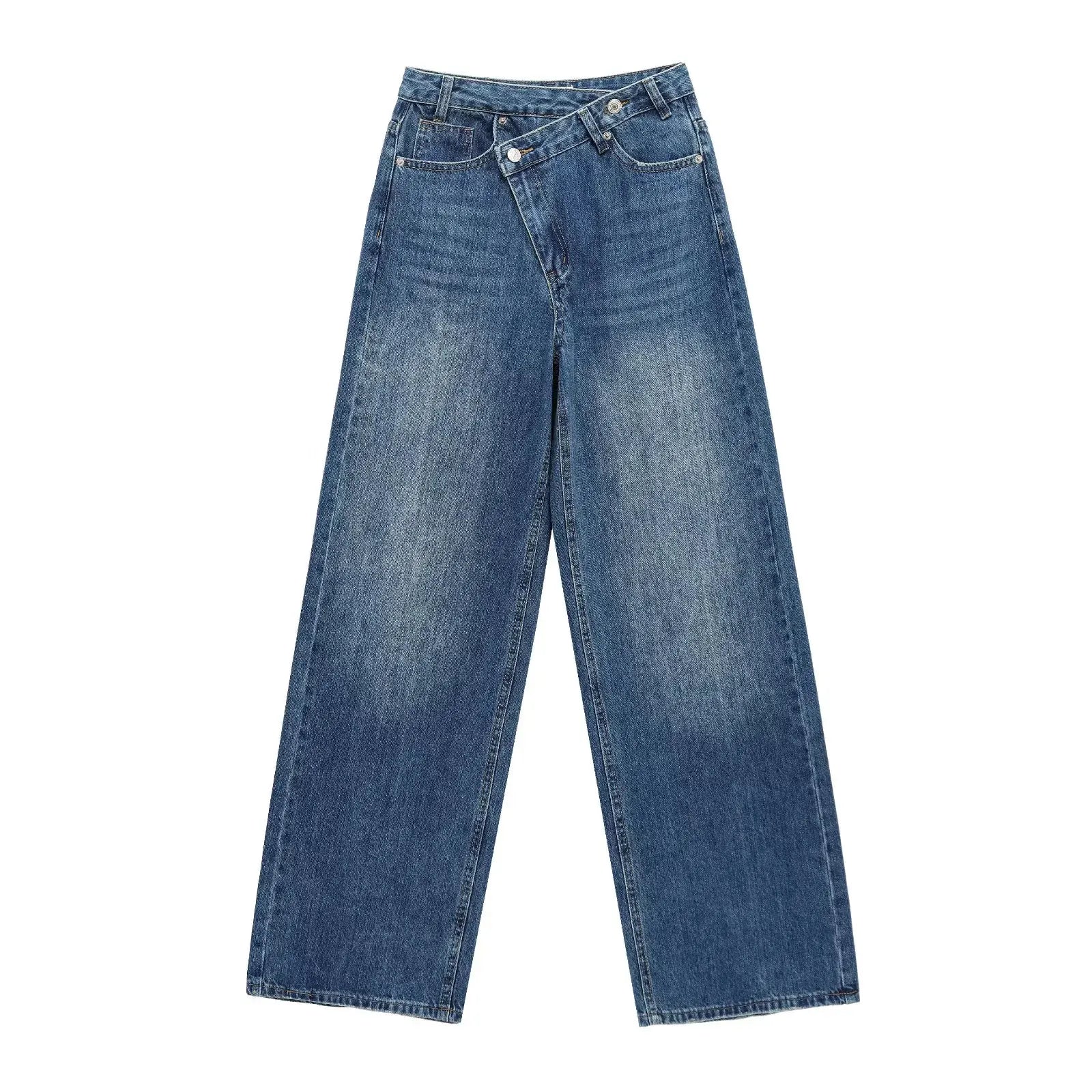 HH Women's Street Fashion Wide-leg Jeans Double-clad Pants With Pockets High Waist Solid Asymmetric Retro Straight Trousers