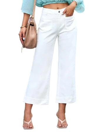 Casual Women Cropped Jeans Straight High Waist Solid Color Multi-Color Button Zipper Pocket Wide Leg Loose Washed Denim Trousers