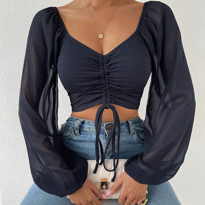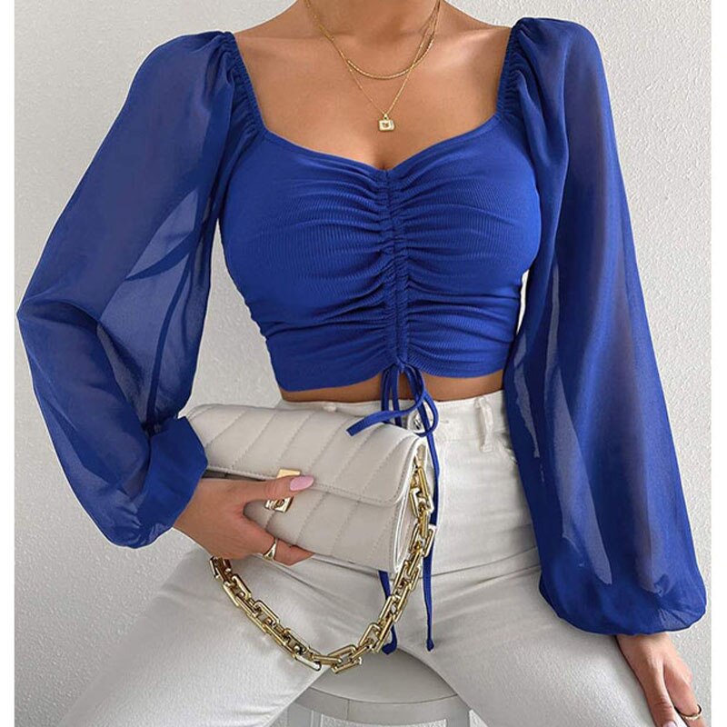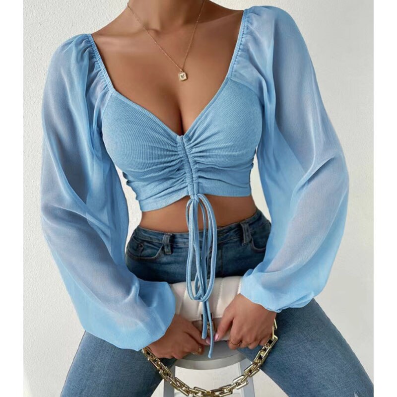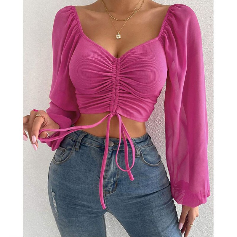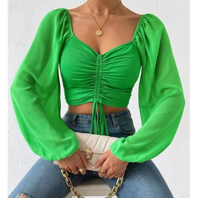 • Chiffon Drawstring Crop Top Women Spring Summer Lantern Sleeve V-Neck Fashion Blouses Hight Street Skinny Sexy Shirt Y2K Clothes