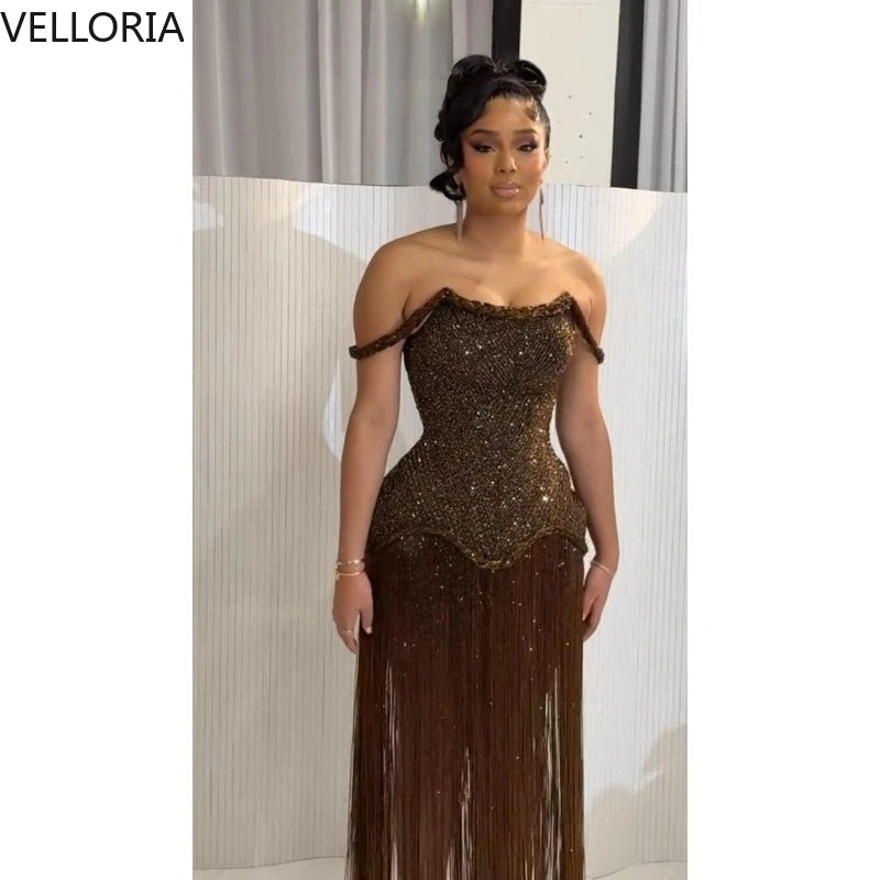 Brown Tassel Evening Dress African Woman Sexy Off-Shoulder Beaded Bustier Prom Gown Elegant Floor-Length Party Dress Customized